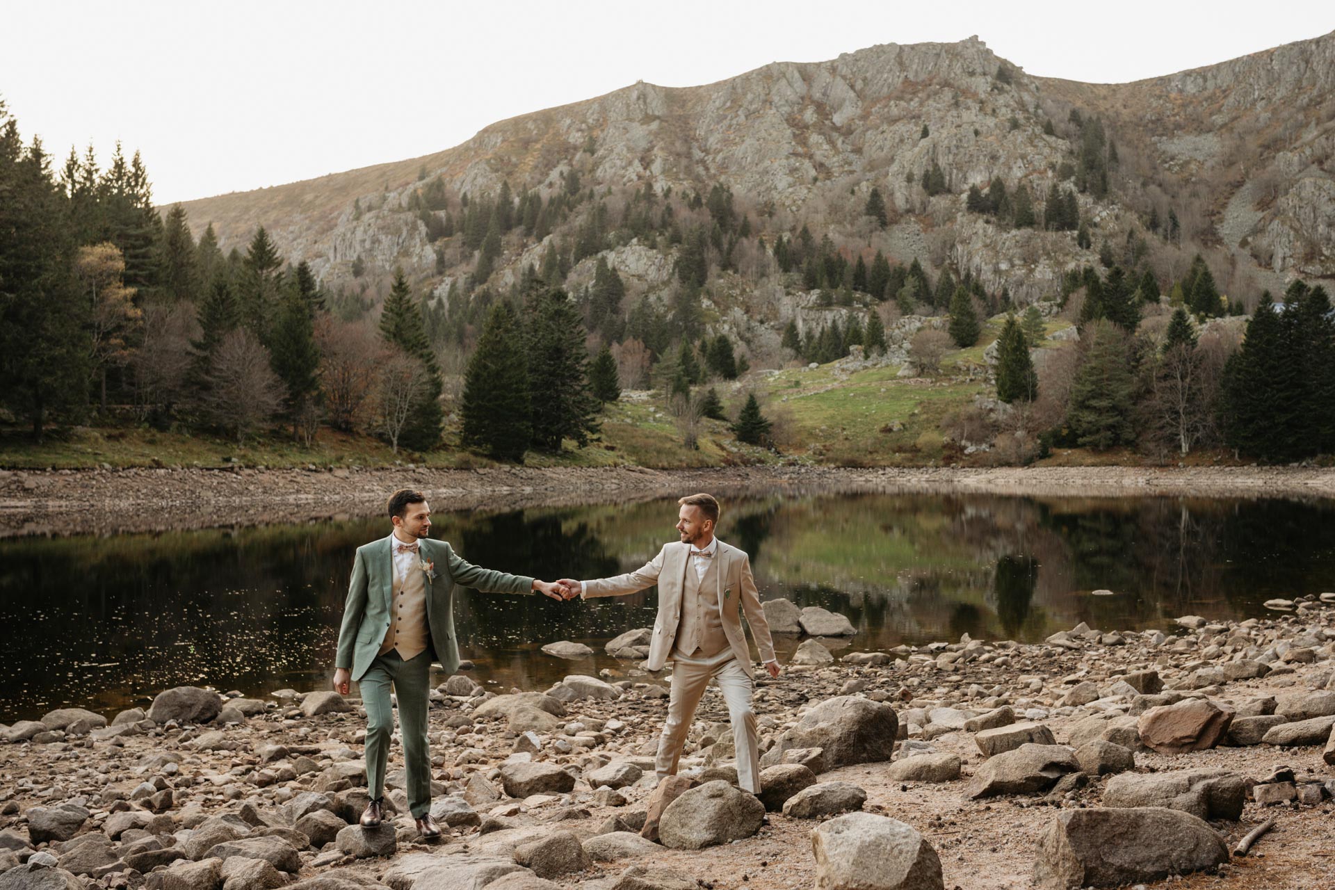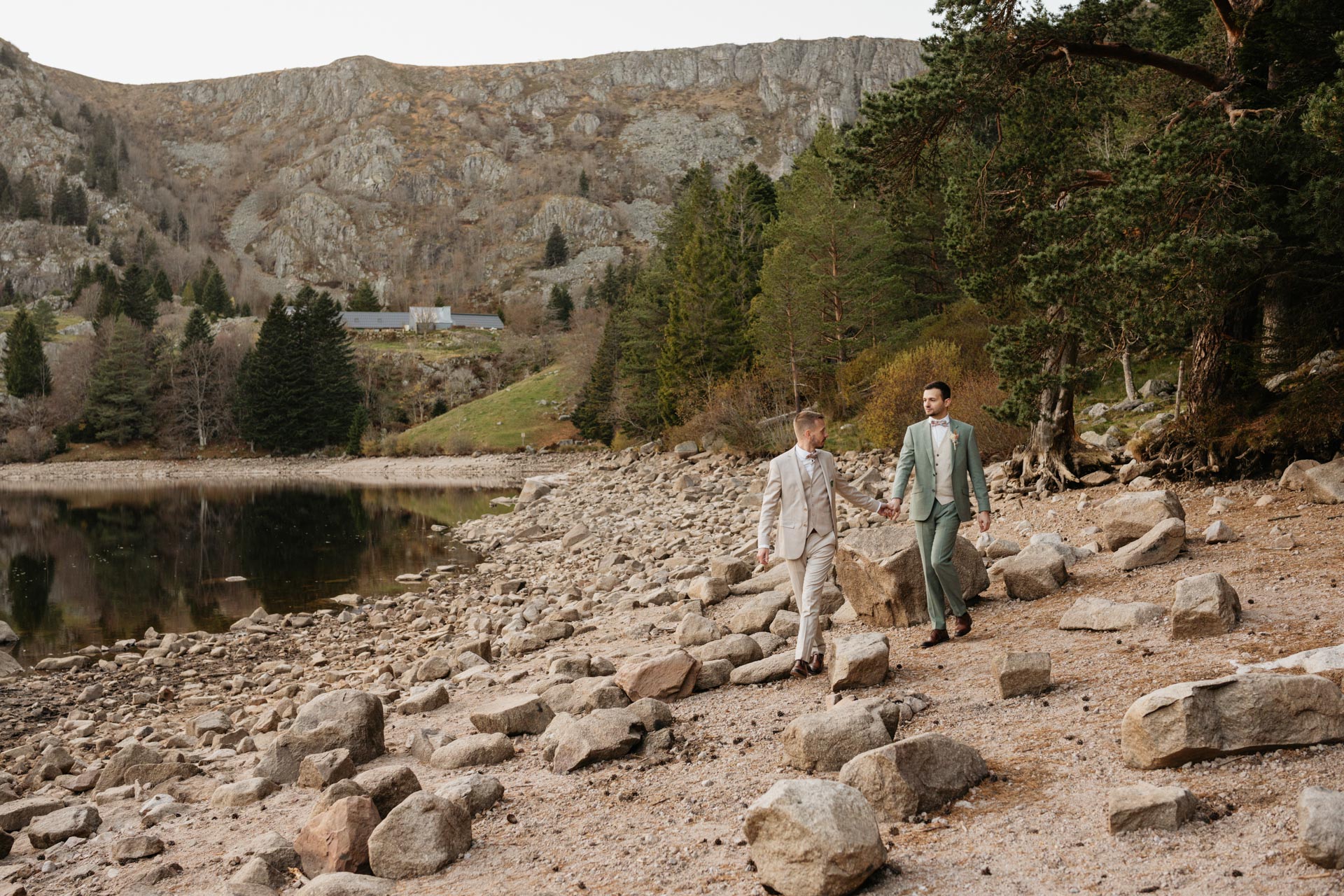 En tenue de mariés, au bord du lac, entre sentiers forestiers, roches brutes et sapins, ils ont revécu l’émotion de leur union dans un décor profondément apaisant. Une atmosphère suspendue, presque hors du temps.