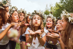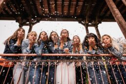 The key is knowing your bride-to-be’s personality and tastes so she has the best time and you can choose a theme she’ll love — chic sailor stripes, flower crowns, 80s vibes with denim jackets, ski & mountain atmosphere, or a pajama party. And don’t forget the personalized accessories: t-shirts, bracelets, balloons, sunglasses, confetti… there are so many ideas to set the mood and create the perfect photoshoot for your group.