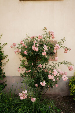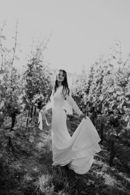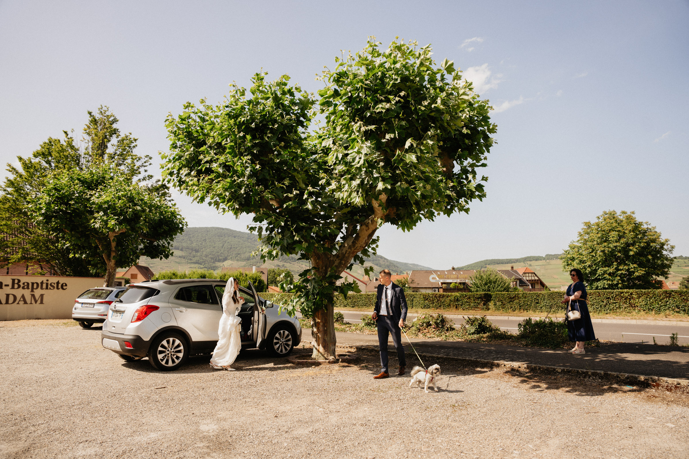 Puis, nous remontons à l’extérieur, au cœur des vignes baignées de lumière. Les rangées de ceps s’étendent sur les collines alsaciennes et dessinent un paysage unique et typique de la région. Mirabelle est le témoin discret de leur amour. Tout au long de la journée, leur petit chien Mirabelle les accompagne. Présente avec douceur et curiosité, elle apporte une touche de tendresse à notre séance photo.