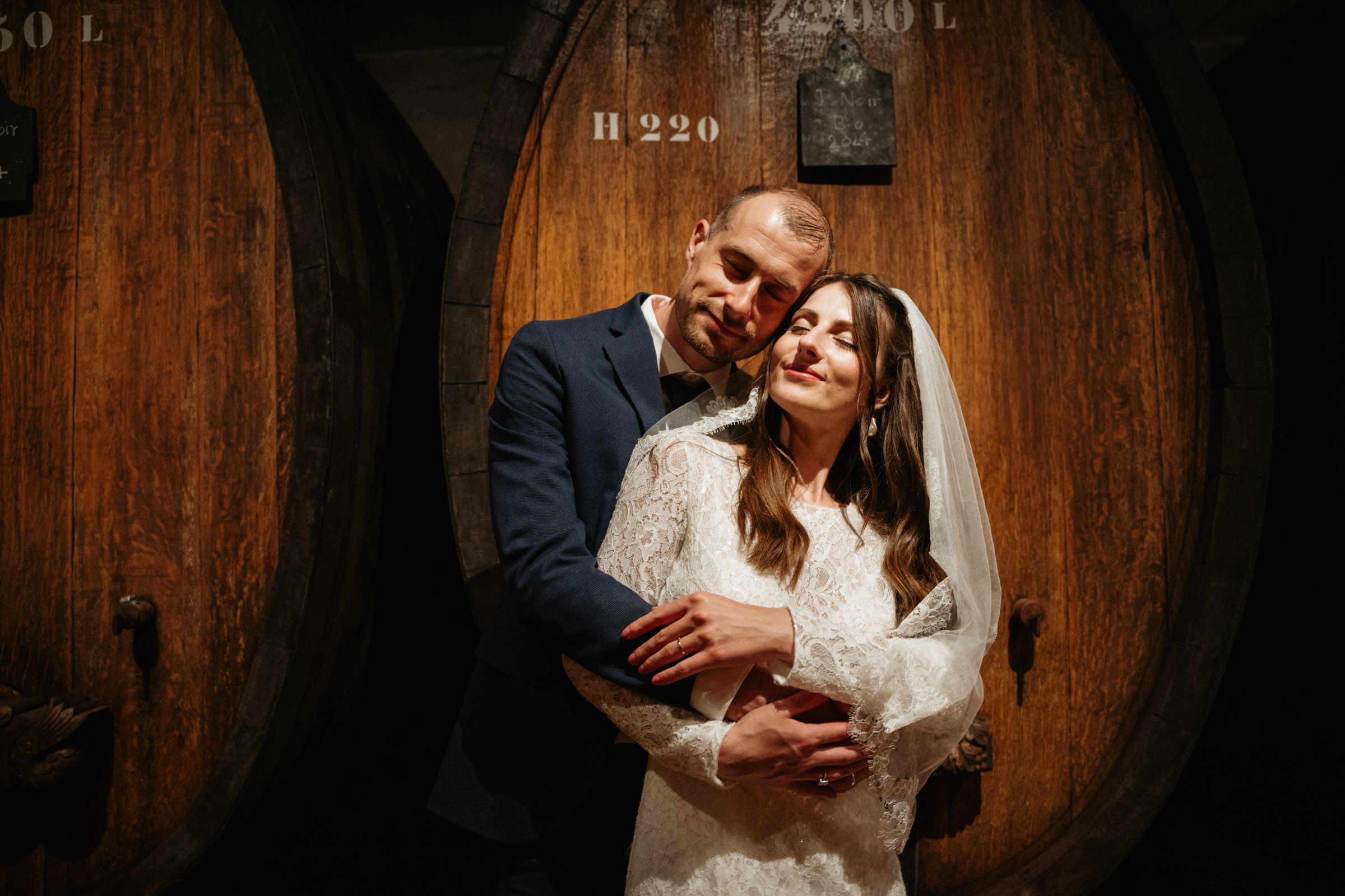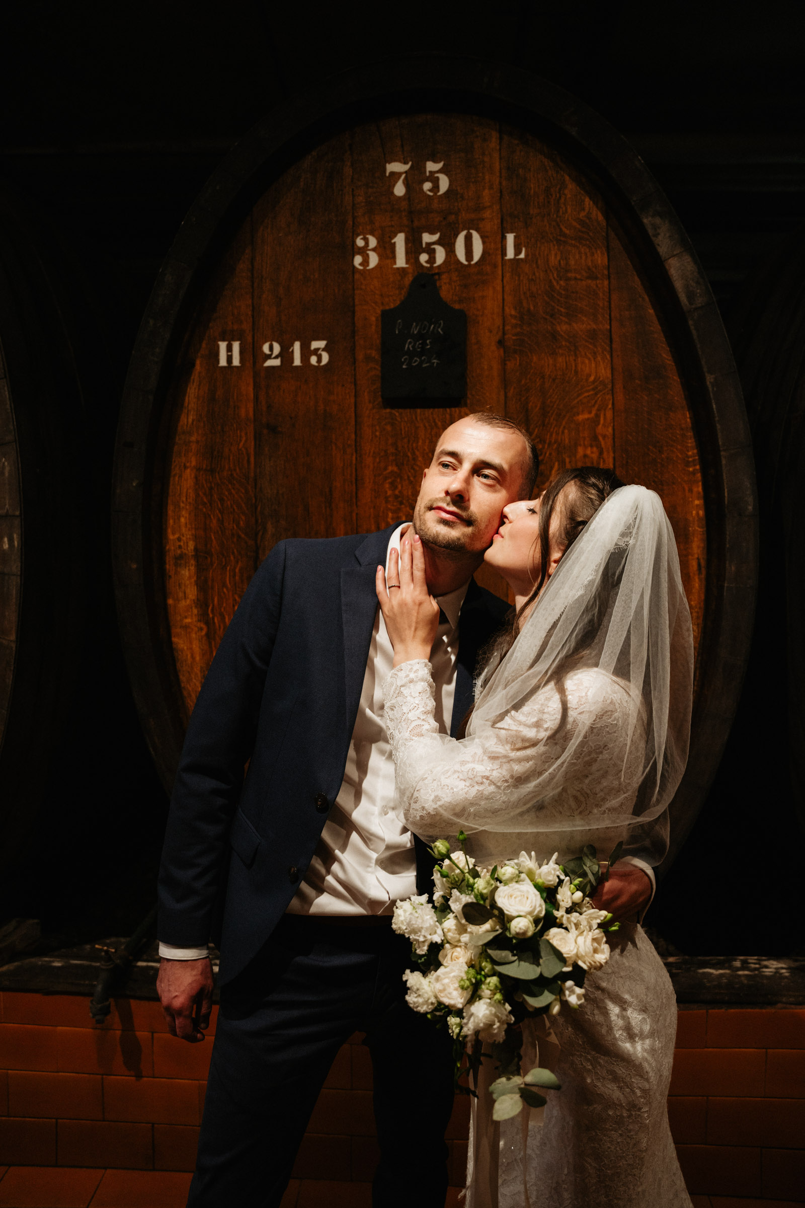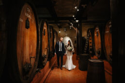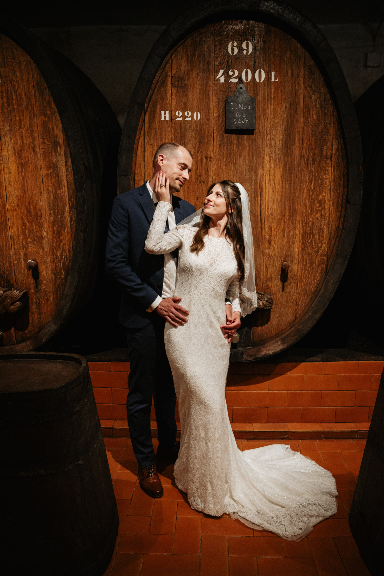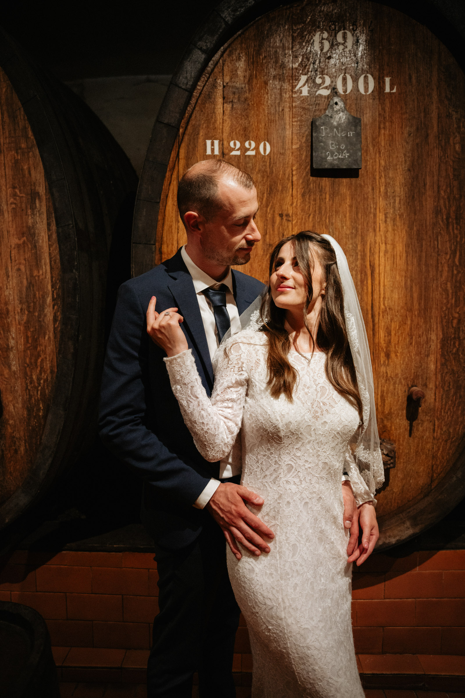 Après ces premiers instants, Dylan et Valeria s’échappent tous les deux. Nous descendons dans les caves du domaine pour une séance couple intime et feutrée. La lumière y est douce, presque cinématographique, révélant les textures de la pierre et du bois. Chaque pas résonne comme si le temps s’était arrêté pour eux.