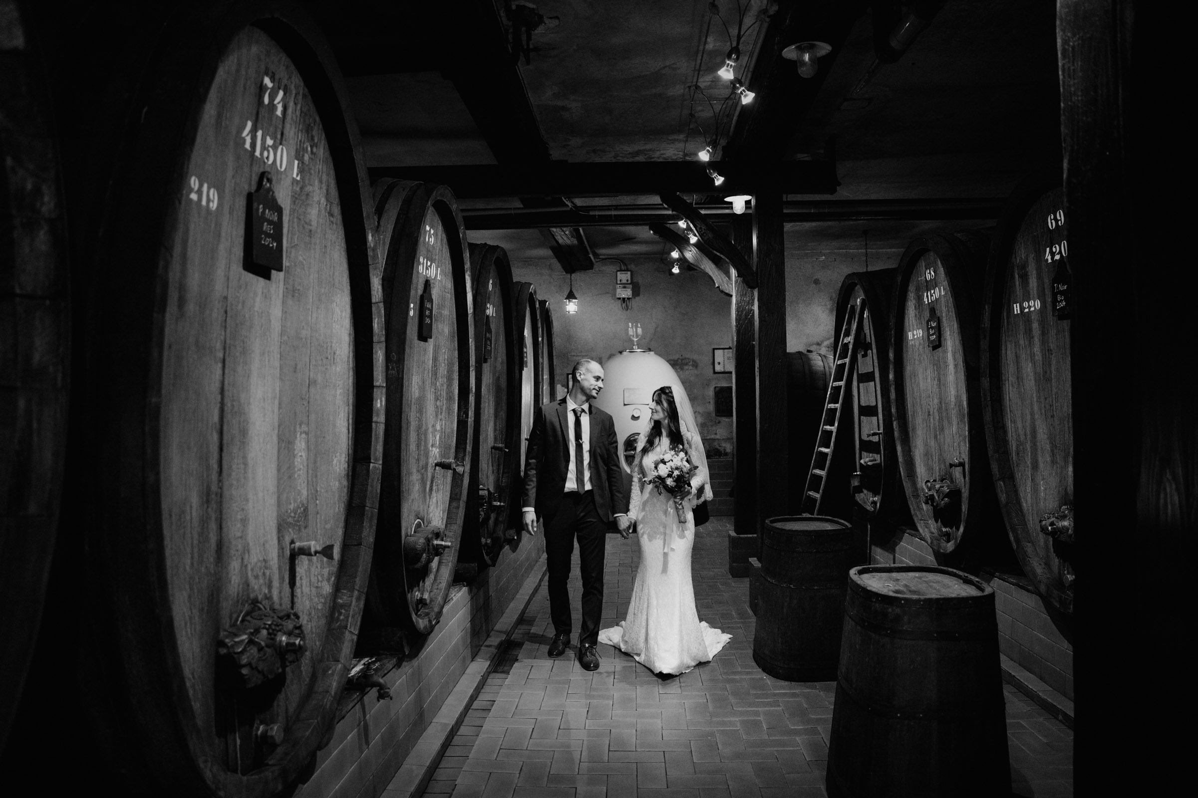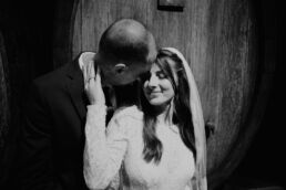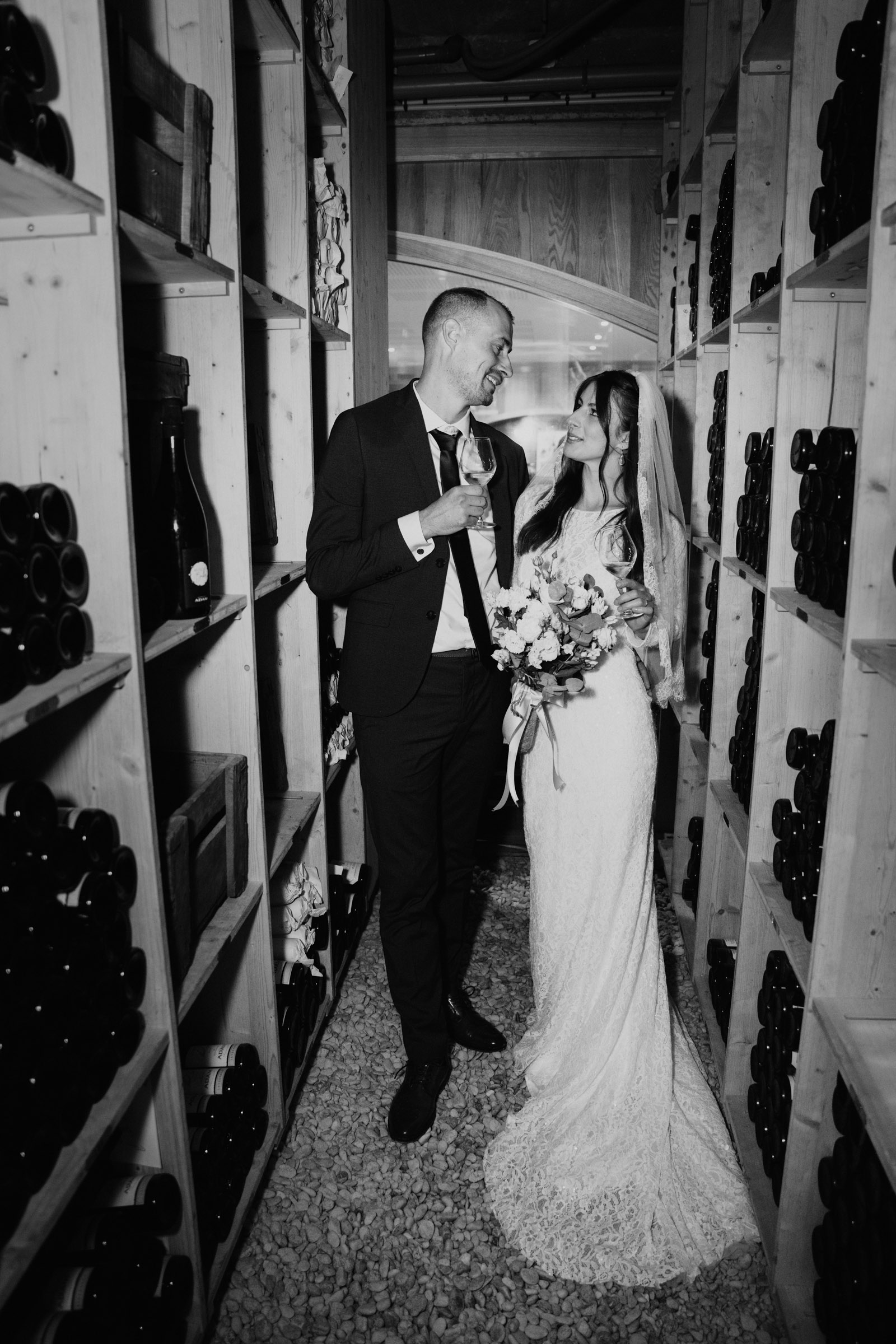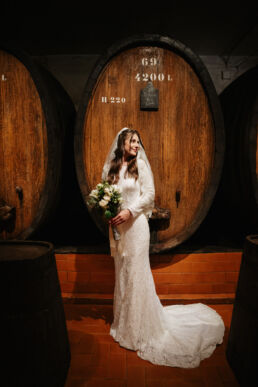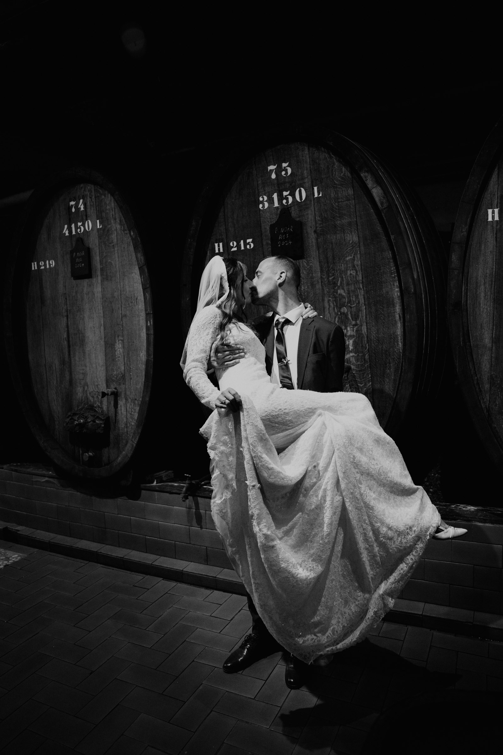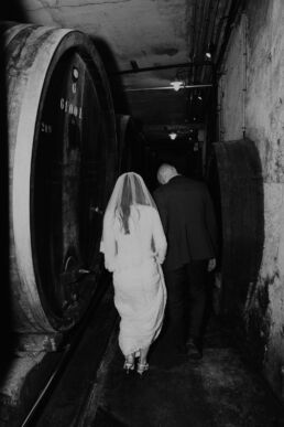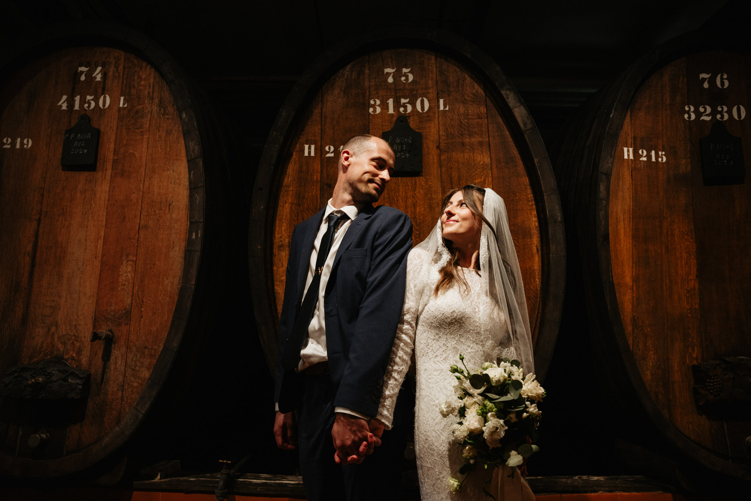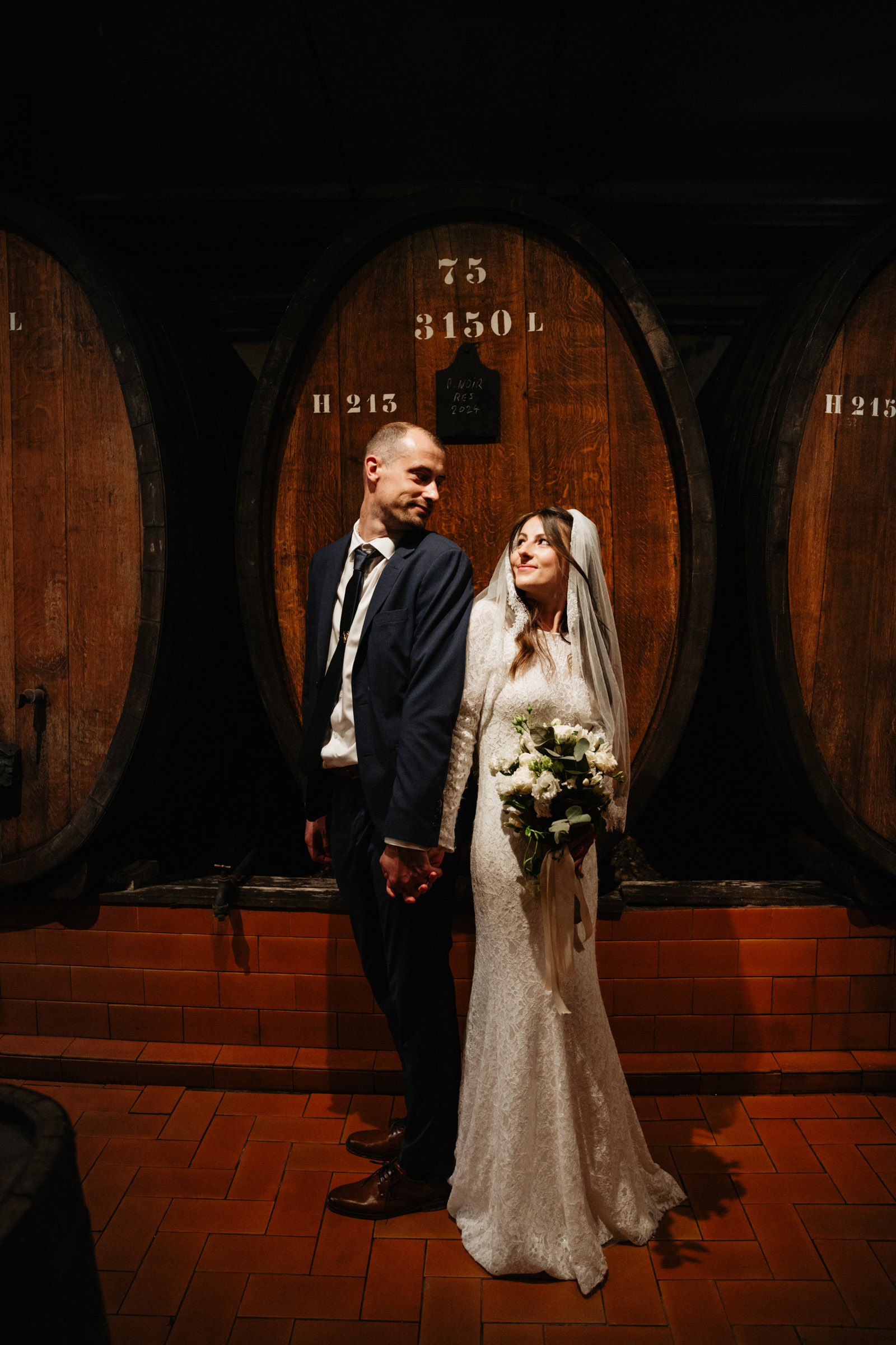 Après ces premiers instants, Dylan et Valeria s’échappent tous les deux. Nous descendons dans les caves du domaine pour une séance couple intime et feutrée. La lumière y est douce, presque cinématographique, révélant les textures de la pierre et du bois. Chaque pas résonne comme si le temps s’était arrêté pour eux.