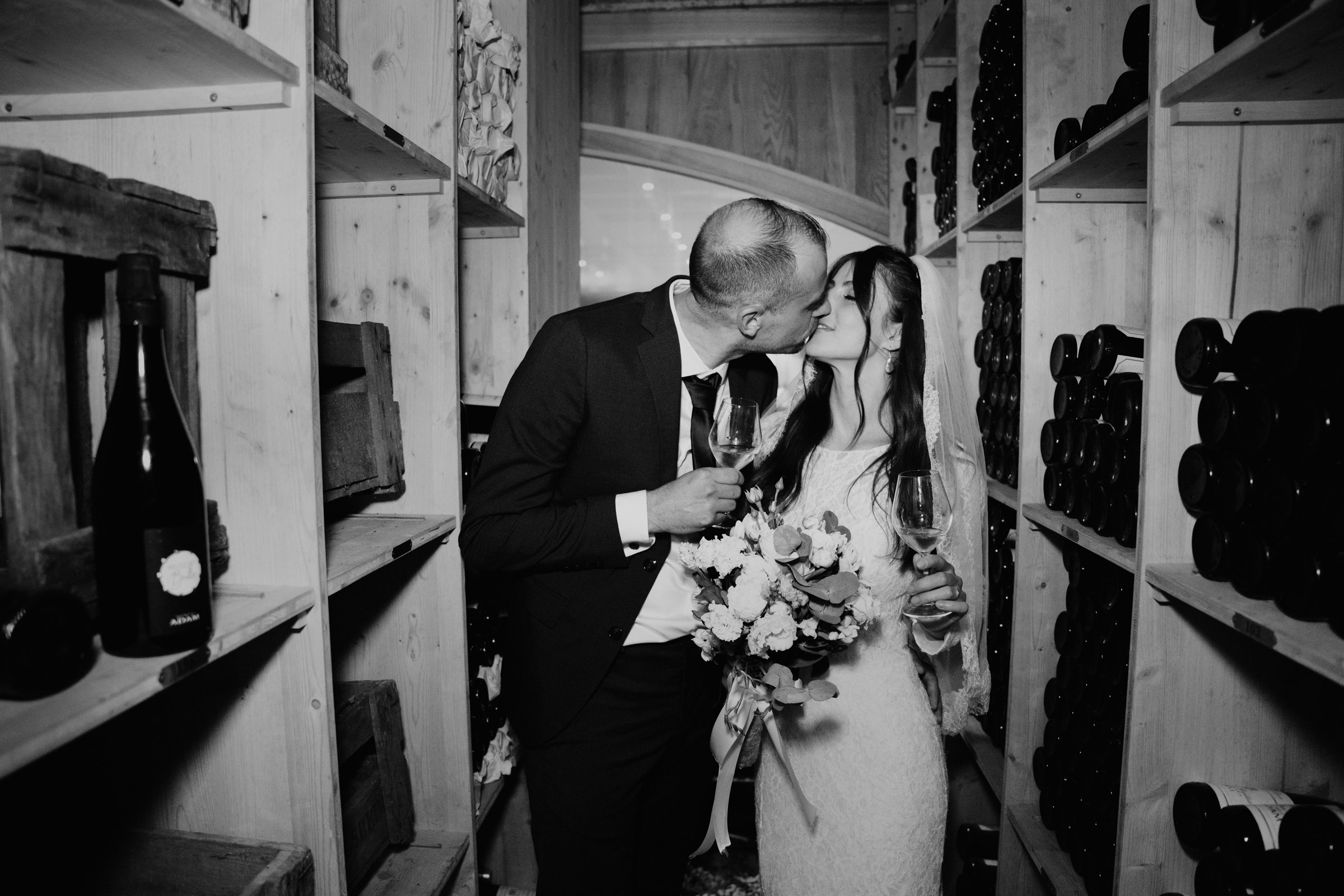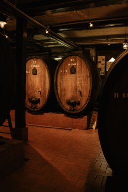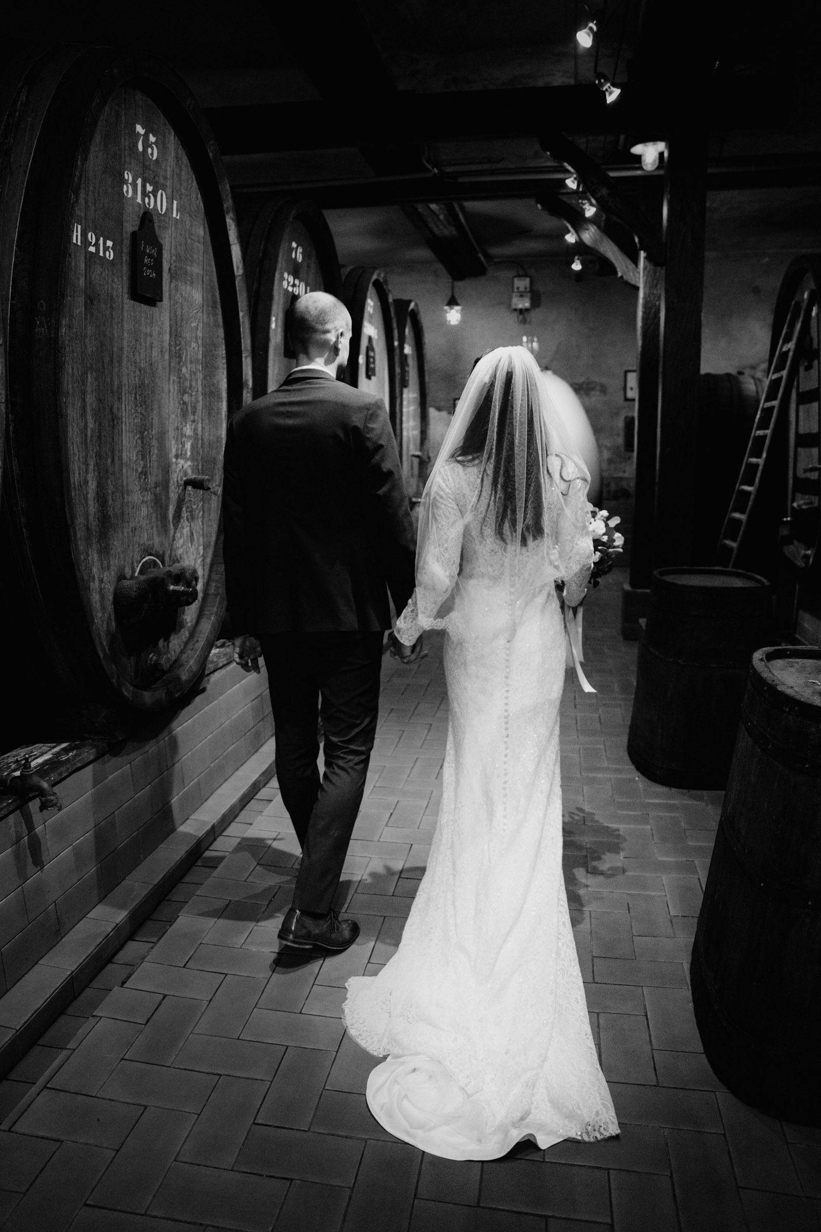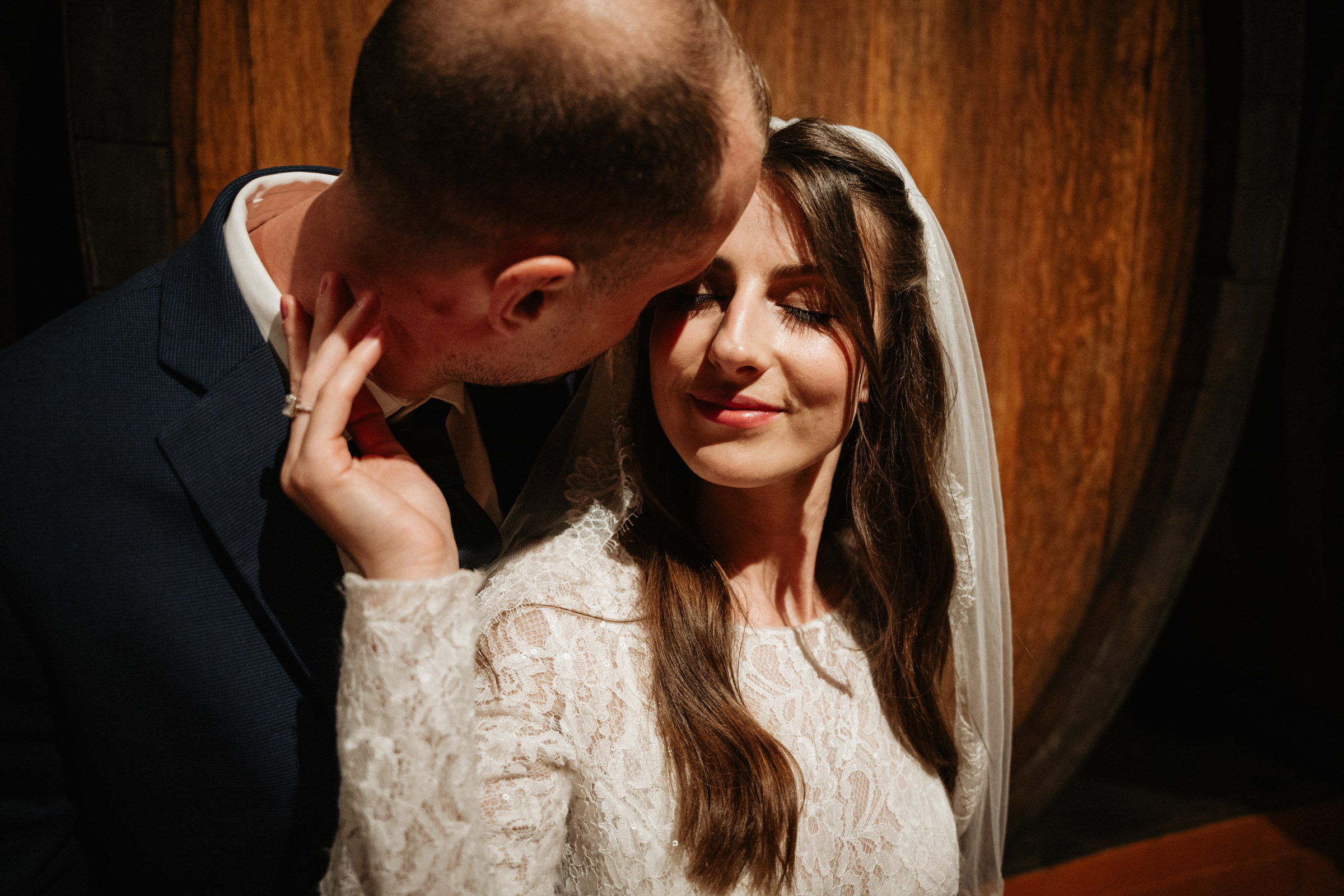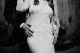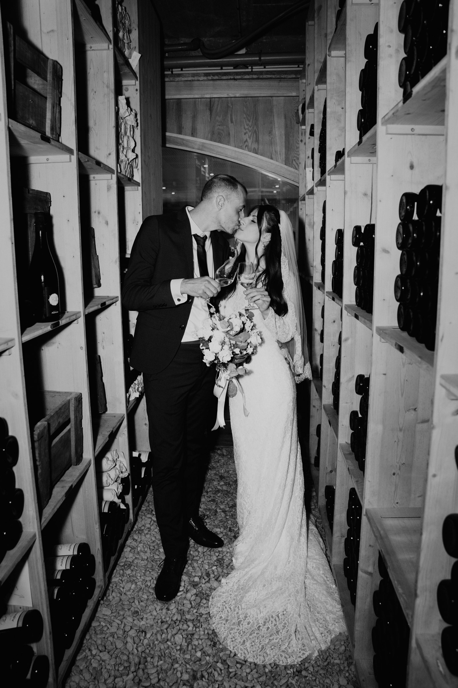 Après ces premiers instants, Dylan et Valeria s’échappent tous les deux. Nous descendons dans les caves du domaine pour une séance couple intime et feutrée. La lumière y est douce, presque cinématographique, révélant les textures de la pierre et du bois. Chaque pas résonne comme si le temps s’était arrêté pour eux.