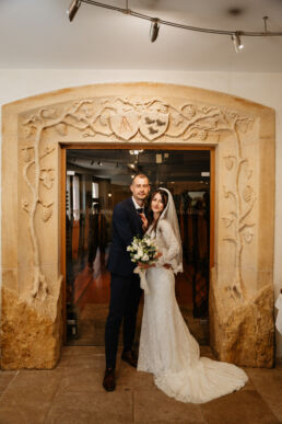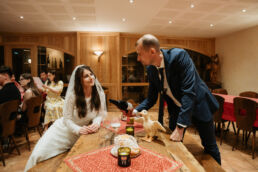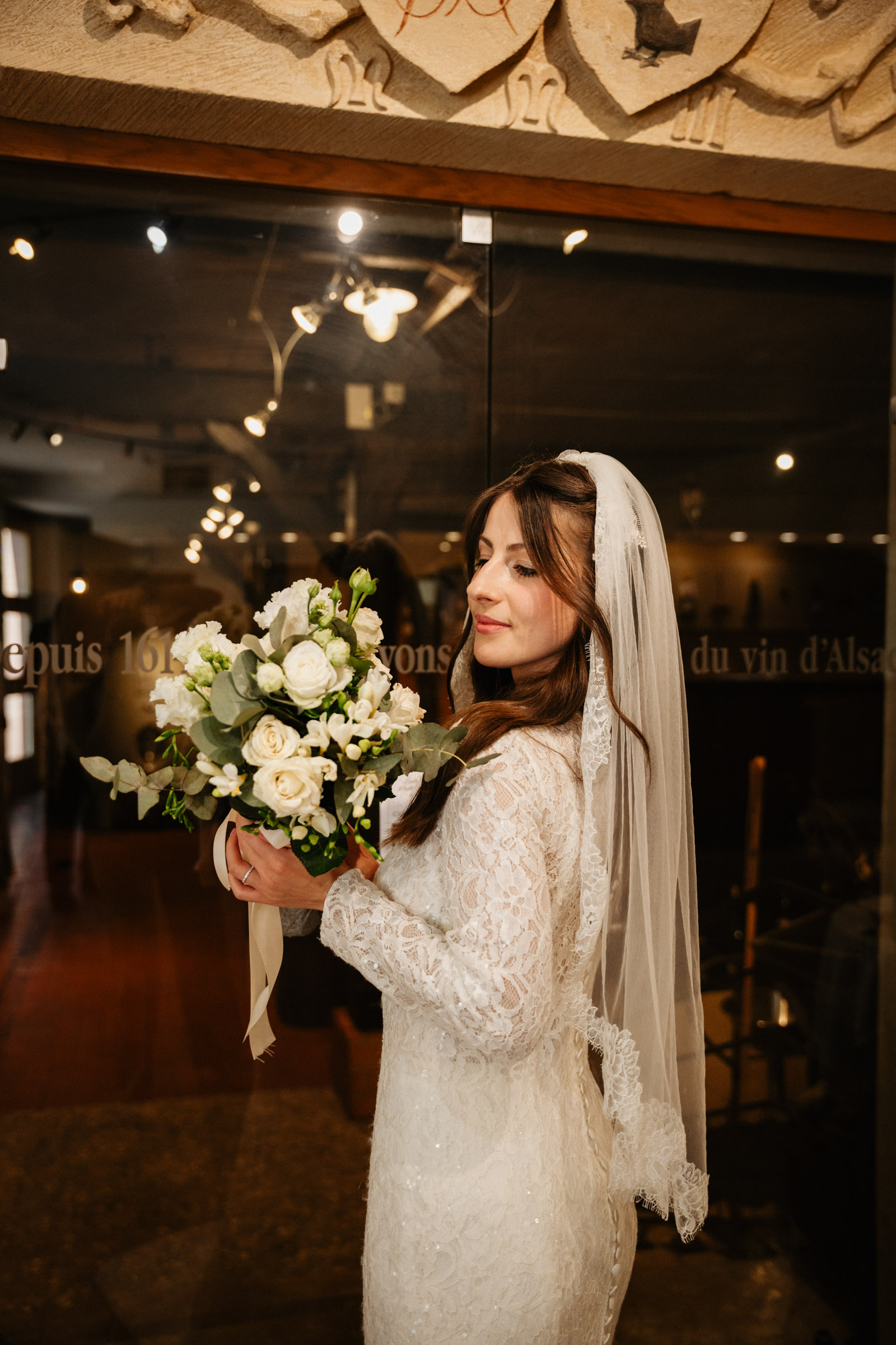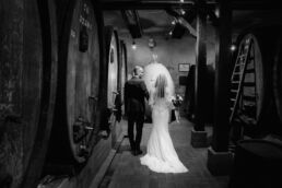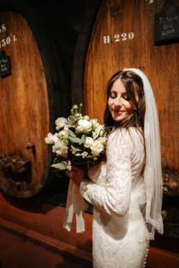 La journée commence par une immersion au cœur du domaine. Dylan et Valeria partagent d’abord un moment avec leur famille lors d’une visite des caves en écoutant attentivement leur guide. Entre les tonneaux de chêne centenaires, ils découvrent ensemble les secrets du vin alsacien, guidés par la passion des vignerons. On prend le temps de regarder, d’écouter, de ressentir. Déjà, le mariage prend la forme d’un voyage sensoriel.