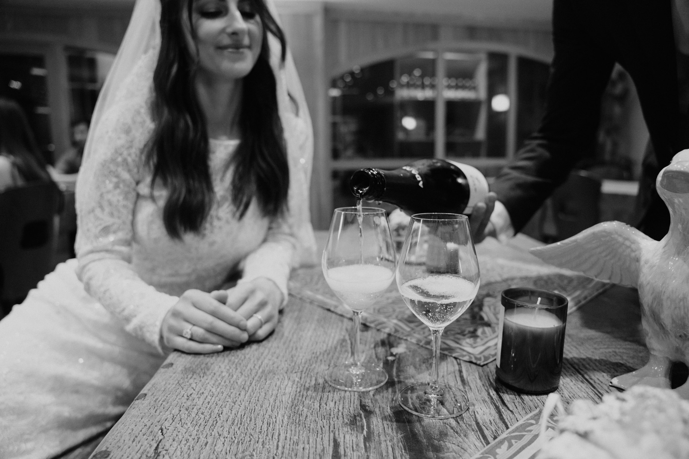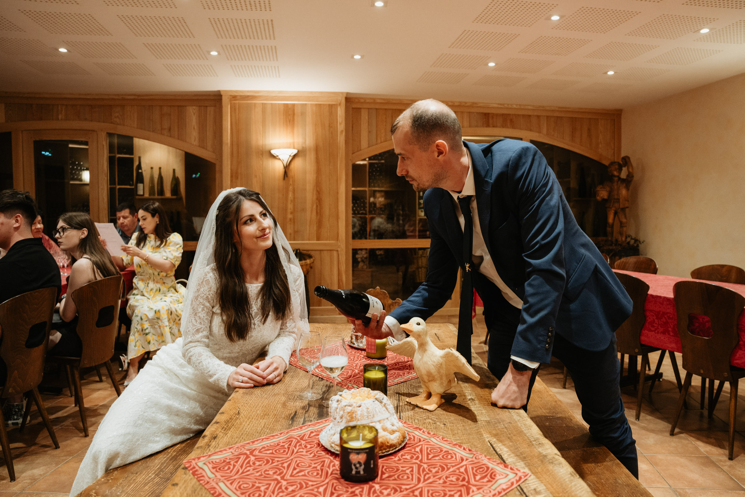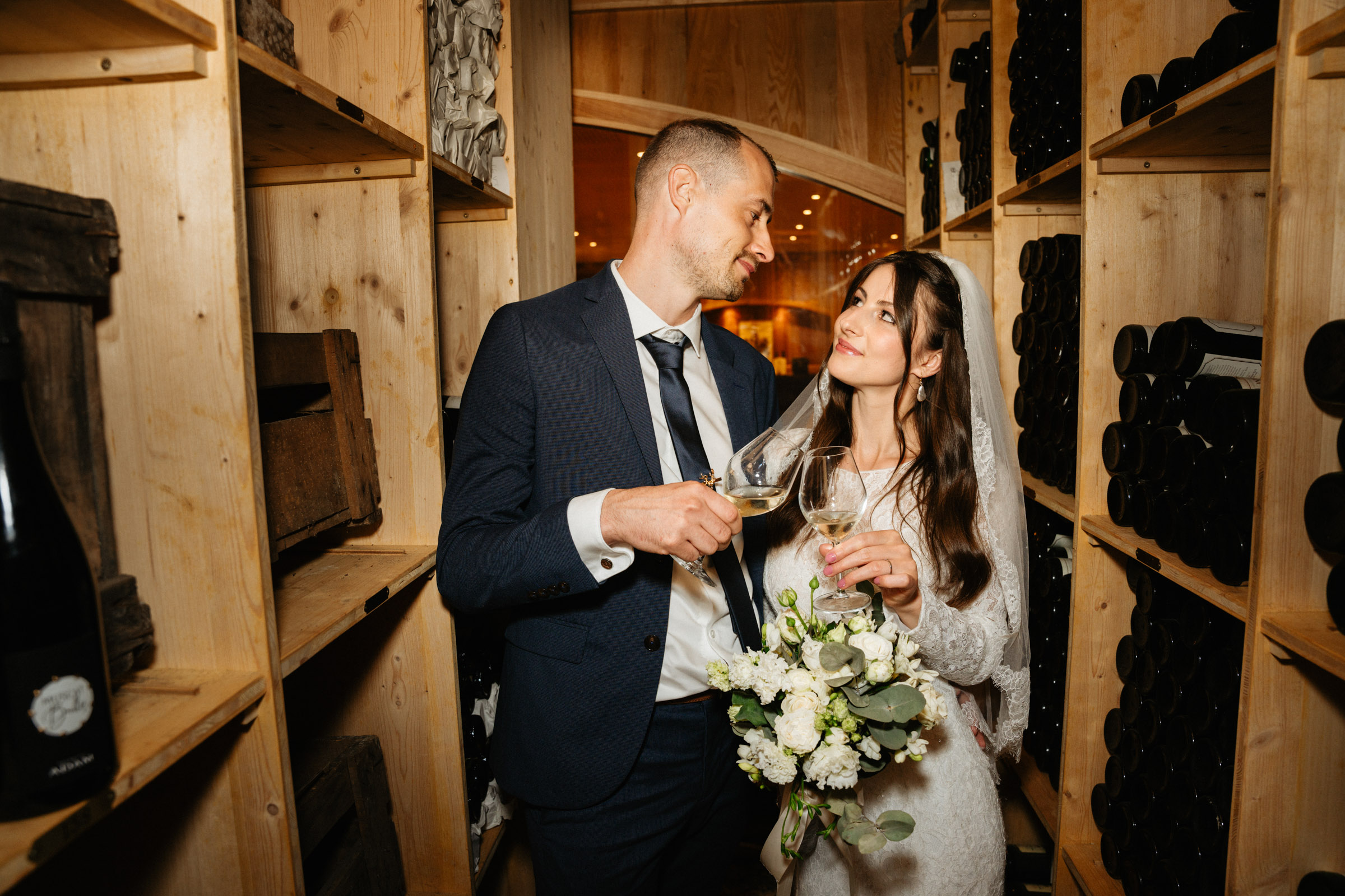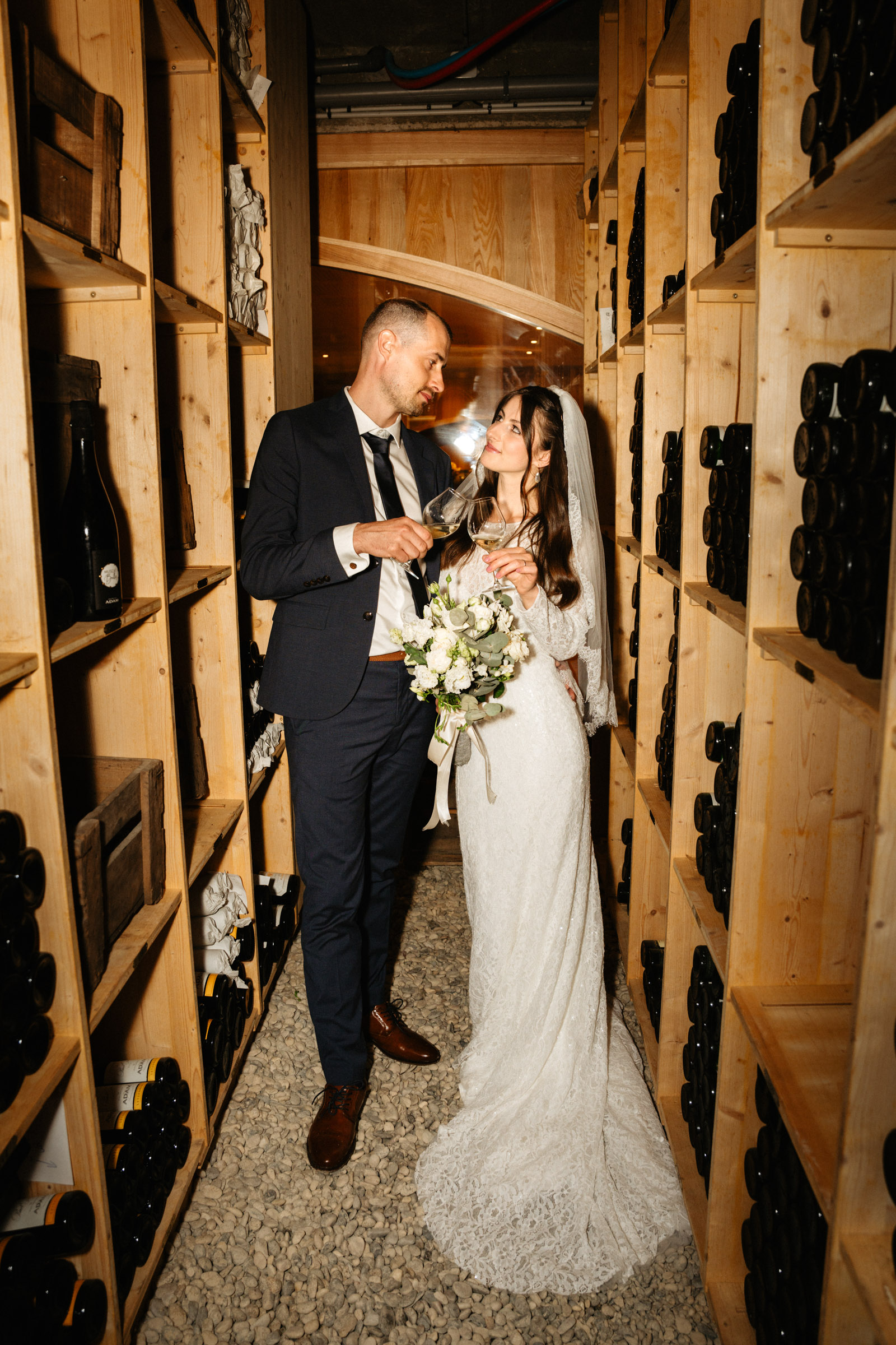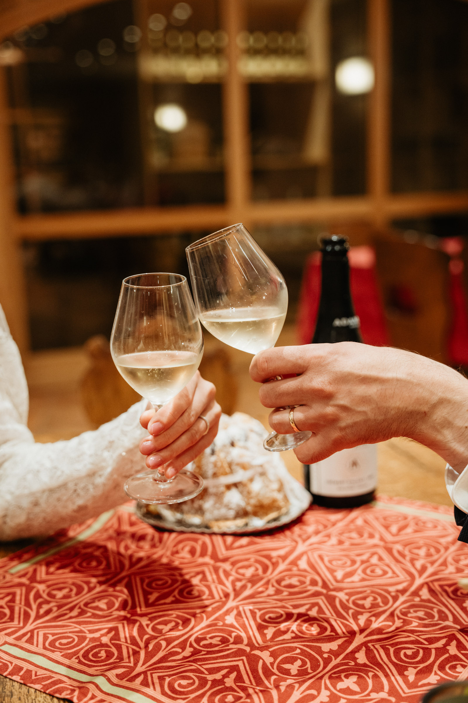 La découverte se poursuit dans l’élégant caveau de dégustation du domaine. Autour de la table, les verres s’entrechoquent. Les vins du domaine révèlent toute leur finesse, accompagnés de rires, de discussions et de regards complices entre les invités. Dans ce moment simple et chaleureux, le mariage prend tout son sens : celui du partage, de la transmission et des liens familiaux.