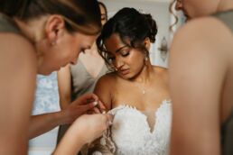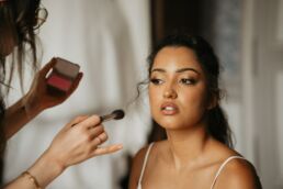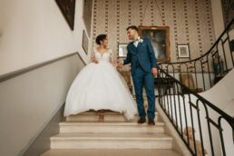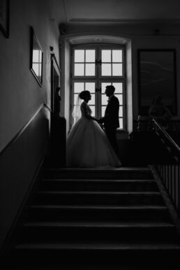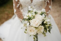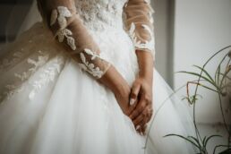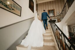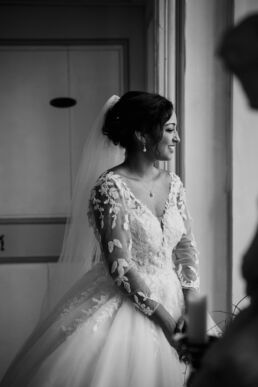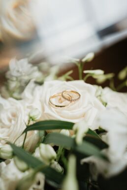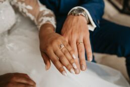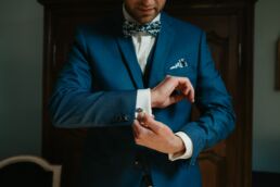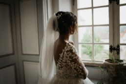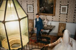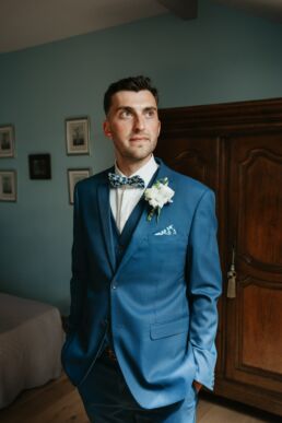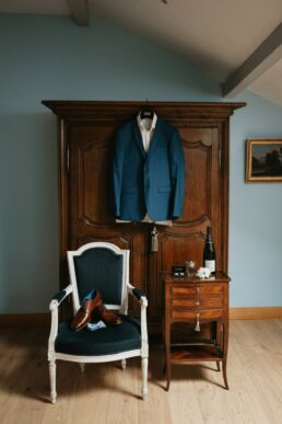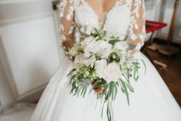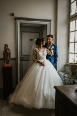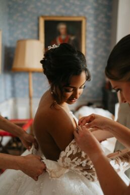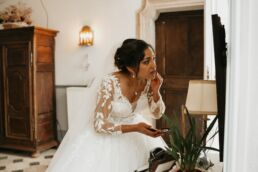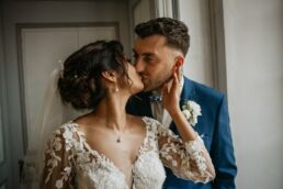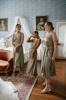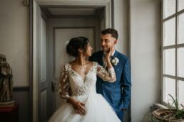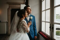 La journée commence doucement, avec la magie des préparatifs dans les chambres du château, le soleil traverse les vieilles fenêtres. Meagan et Jean-Baptiste sont entourés de leur proche, et l’excitation monte progressivement pendant qu’ils se préparent chacun de leur côté. C’est le moment de prendre en photo tous les petits détails qui reflètent l’essence du mariage : papeterie, bouquet, alliances, photos du lieu, portraits à la volée… La première découverte entre Megan et son papa avant qu’elle ne se marie est bouleversante.