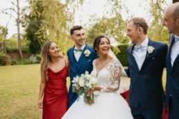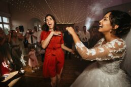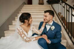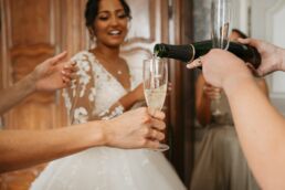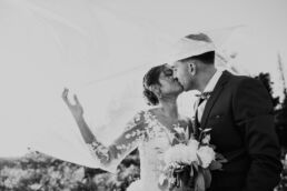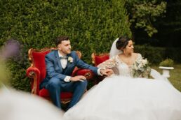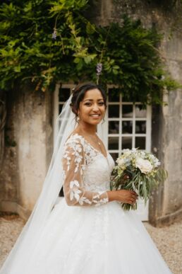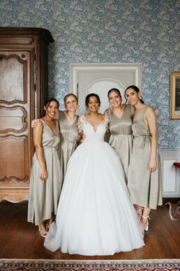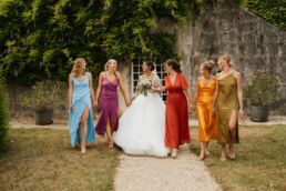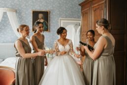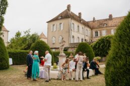 Après la cérémonie, les invités se rassemblent près des élégantes fontaines du château pour un cocktail au soleil et quelques photos de groupe dans lesquels chacun se prend plus ou moins au sérieux pour immortaliser les retrouvailles. Les rires flottent dans l’air, et le champagne coule à flot dans une ambiance conviviale. Lorsque la pluie s’invite, Meagan et Jean-Baptiste en profitent pour faire quelques photos de couple dans le château en toute intimité.