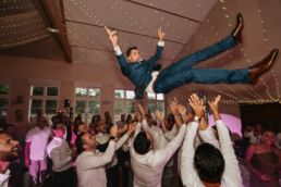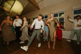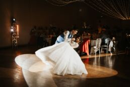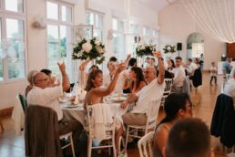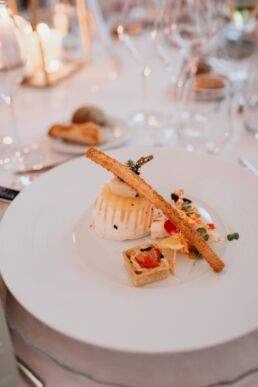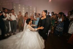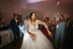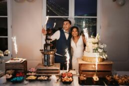 A la tombée de la nuit, la fête continue à l’intérieur. Les invités accueillent Meagan et Jean-Baptiste sous une haie d’honneur bordée d’étincelles. Ils ont pris place dans la salle chaleureuse et lumineuse, à la décoration épurée. Tout est préparé avec soin dans les moindres détails. Une farandole de plats délicieux s’enchaînent, le tout dans une ambiance détendue. Puis vient l’heure de la première danse. La salle s’est remplie d’émotion devant le spectacle offert par les mariés. Famille et amis ont dansé jusqu’au bout de la nuit, partageant histoires, rires et ce genre d’énergie unique qui naît quand l’amour est réel et sincère.
