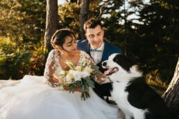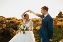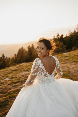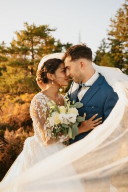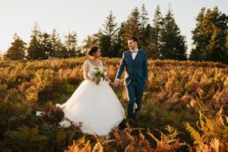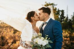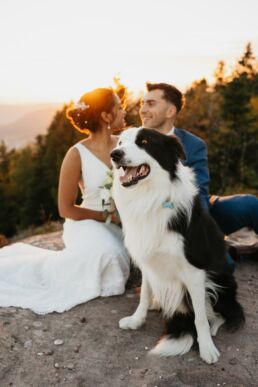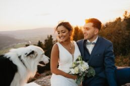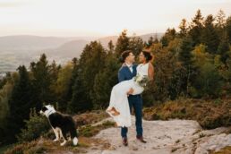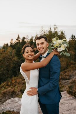 Quelques mois après cette journée incroyable, Meagan et Jean-Baptiste me contactent pour réaliser leur séance Day After. L’occasion de porter une nouvelle fois les tenues du grand jour, mais aussi de choisir la date idéale pour profiter de la magnifique golden hour dans les montagnes vosgiennes. C’est à l’automne que nos chemins se croisent de nouveaux et je les guides avec douceur d’un paysage doré à un autre, avec leur fidèle compagnon à leurs côtés. Une belle occasion d’ajouter encore une page à ce merveilleux chapitre de leur vie.