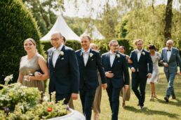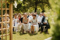 La cérémonie a lieu dans les jardins du château, sous un ciel doux et entourés de fleurs et de verdure. Quand Meagan fait son entrée, les larmes se mettent à couler discrètement. Les familles et leurs amis ne parlent pas peut-être pas la même langue, mais ils partagent les mêmes sentiments : l’amour et la joie d’être présent.