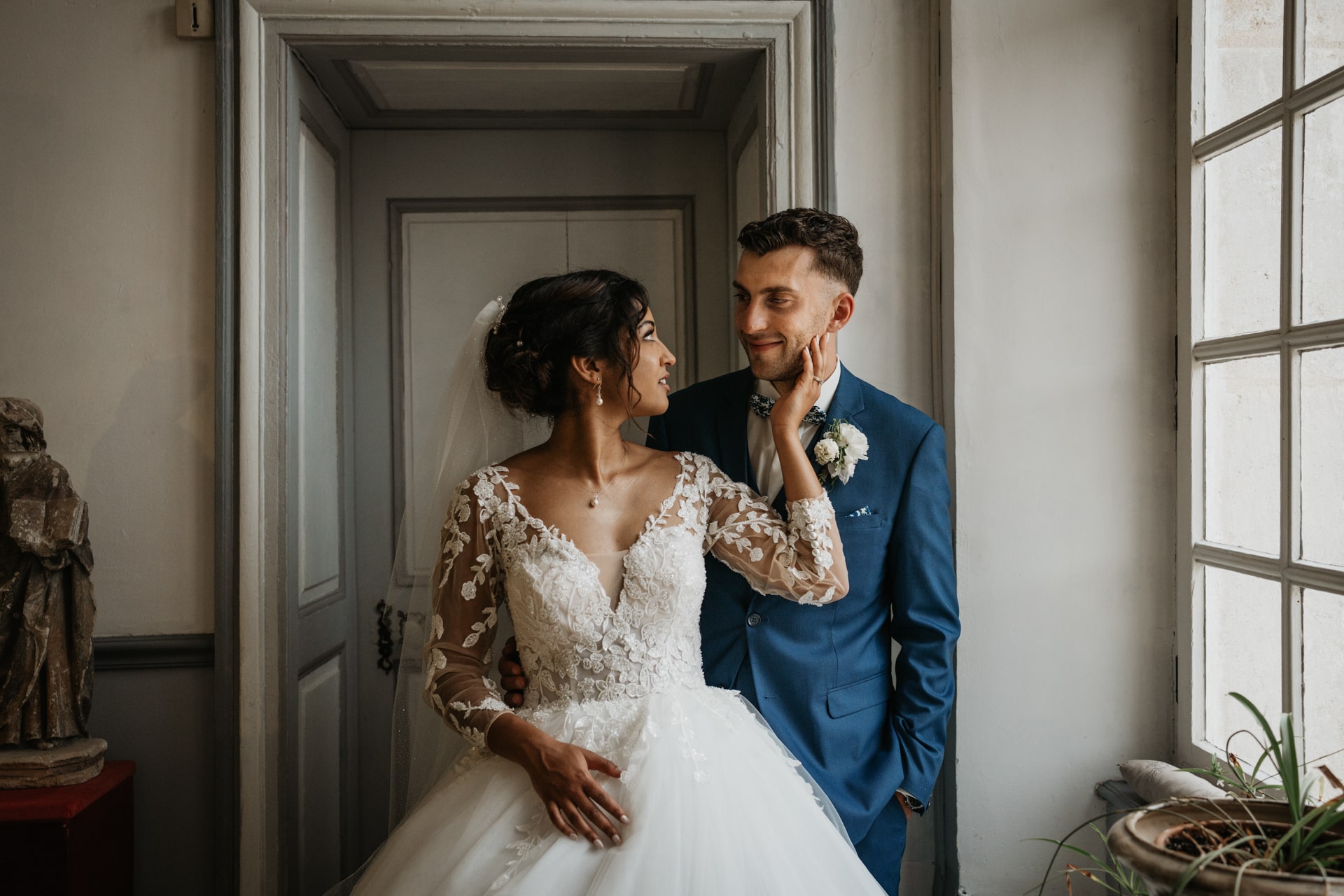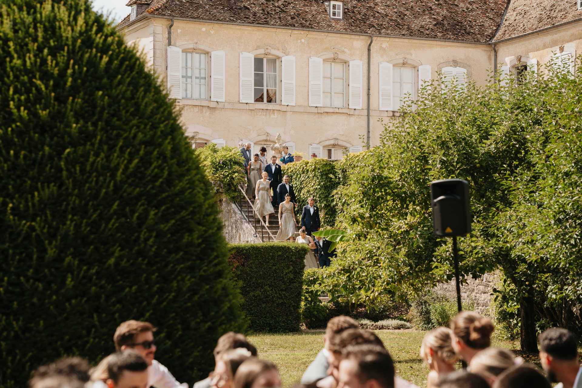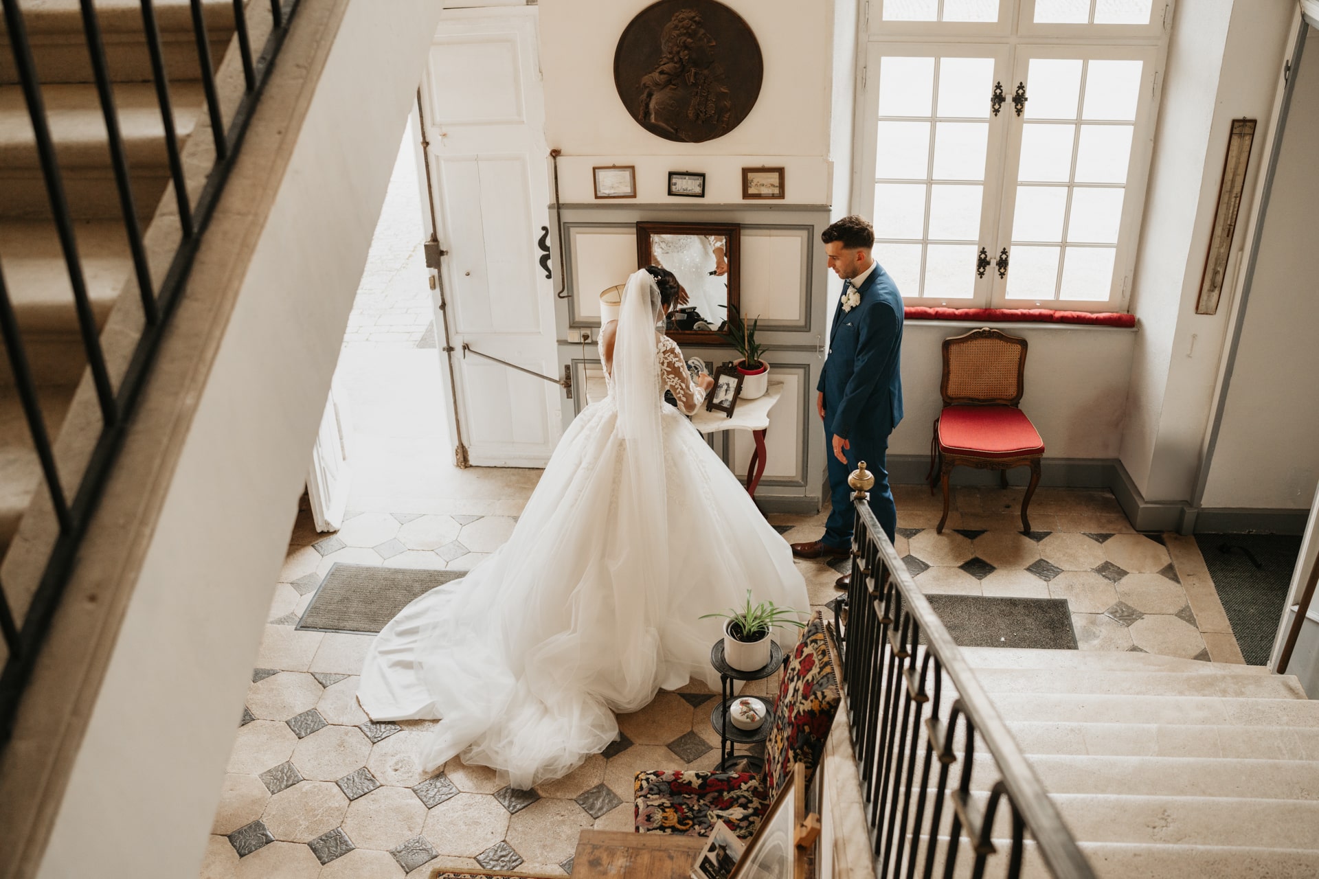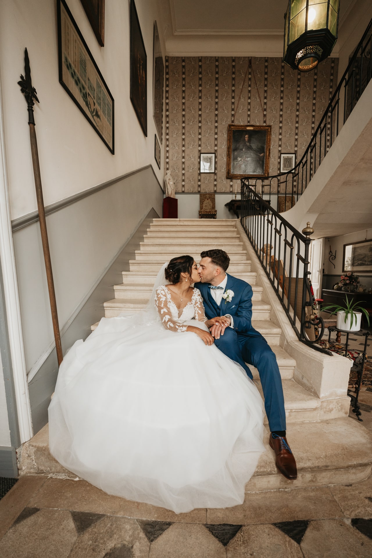 Après la cérémonie, les invités se rassemblent près des élégantes fontaines du château pour un cocktail au soleil et quelques photos de groupe dans lesquels chacun se prend plus ou moins au sérieux pour immortaliser les retrouvailles. Les rires flottent dans l’air, et le champagne coule à flot dans une ambiance conviviale. Lorsque la pluie s’invite, Meagan et Jean-Baptiste en profitent pour faire quelques photos de couple dans le château en toute intimité.