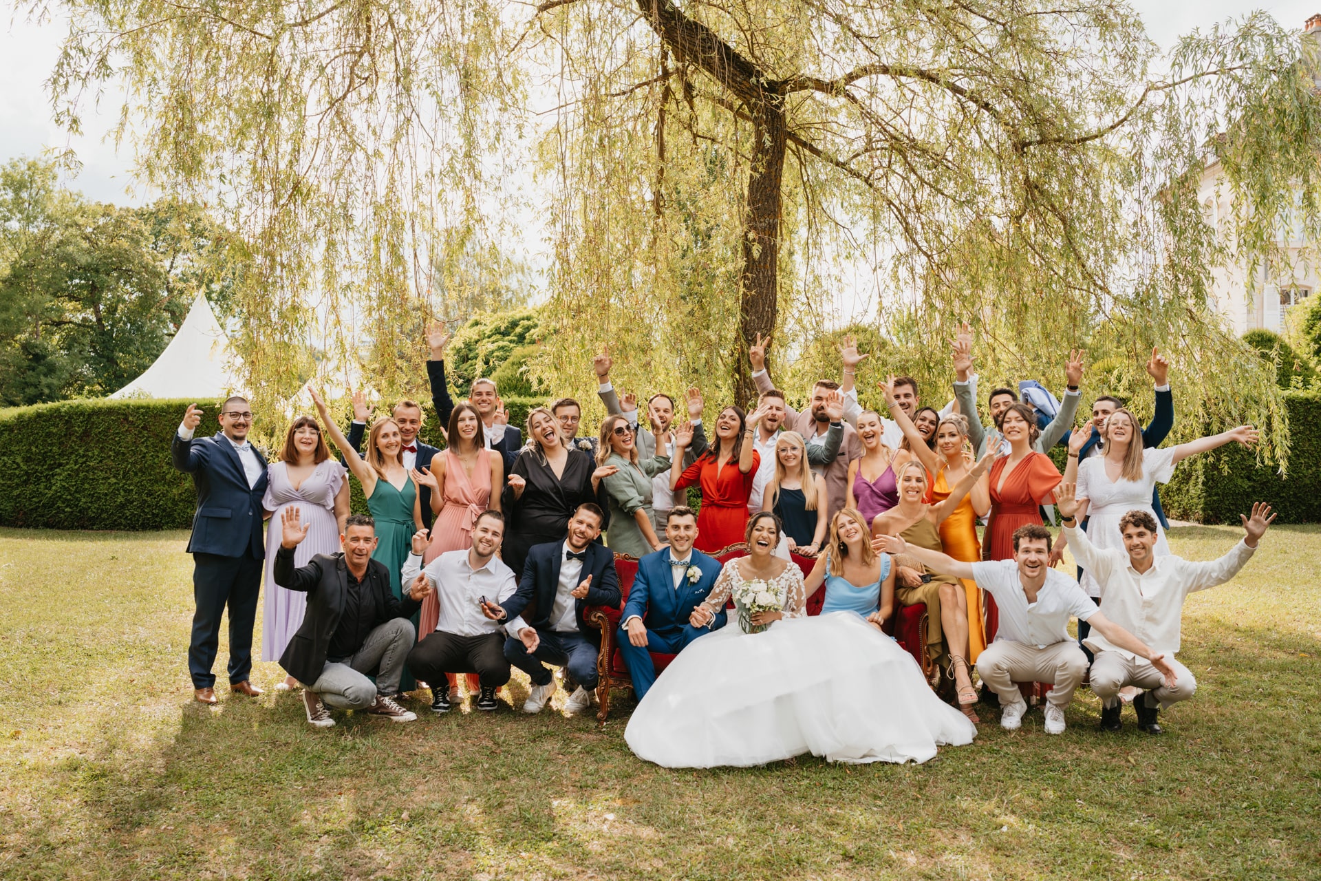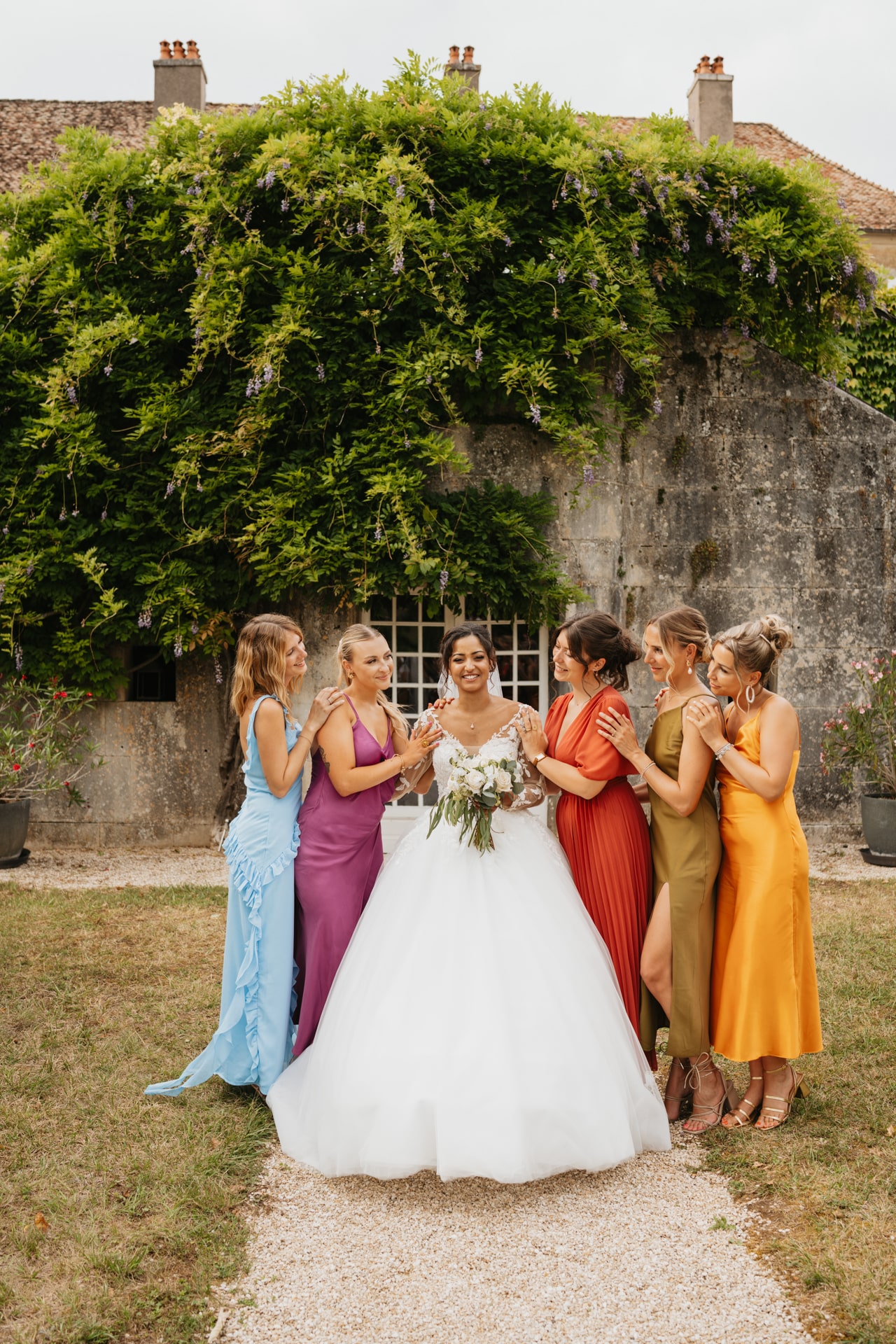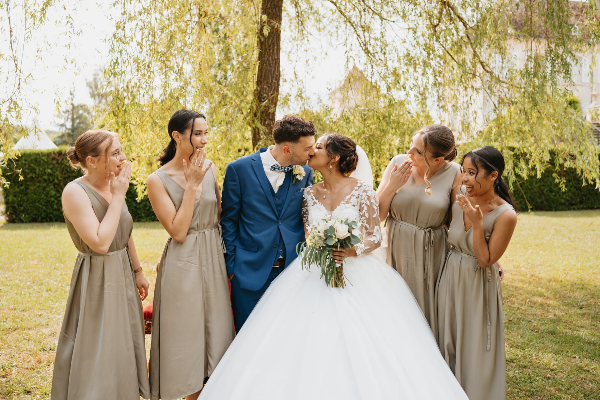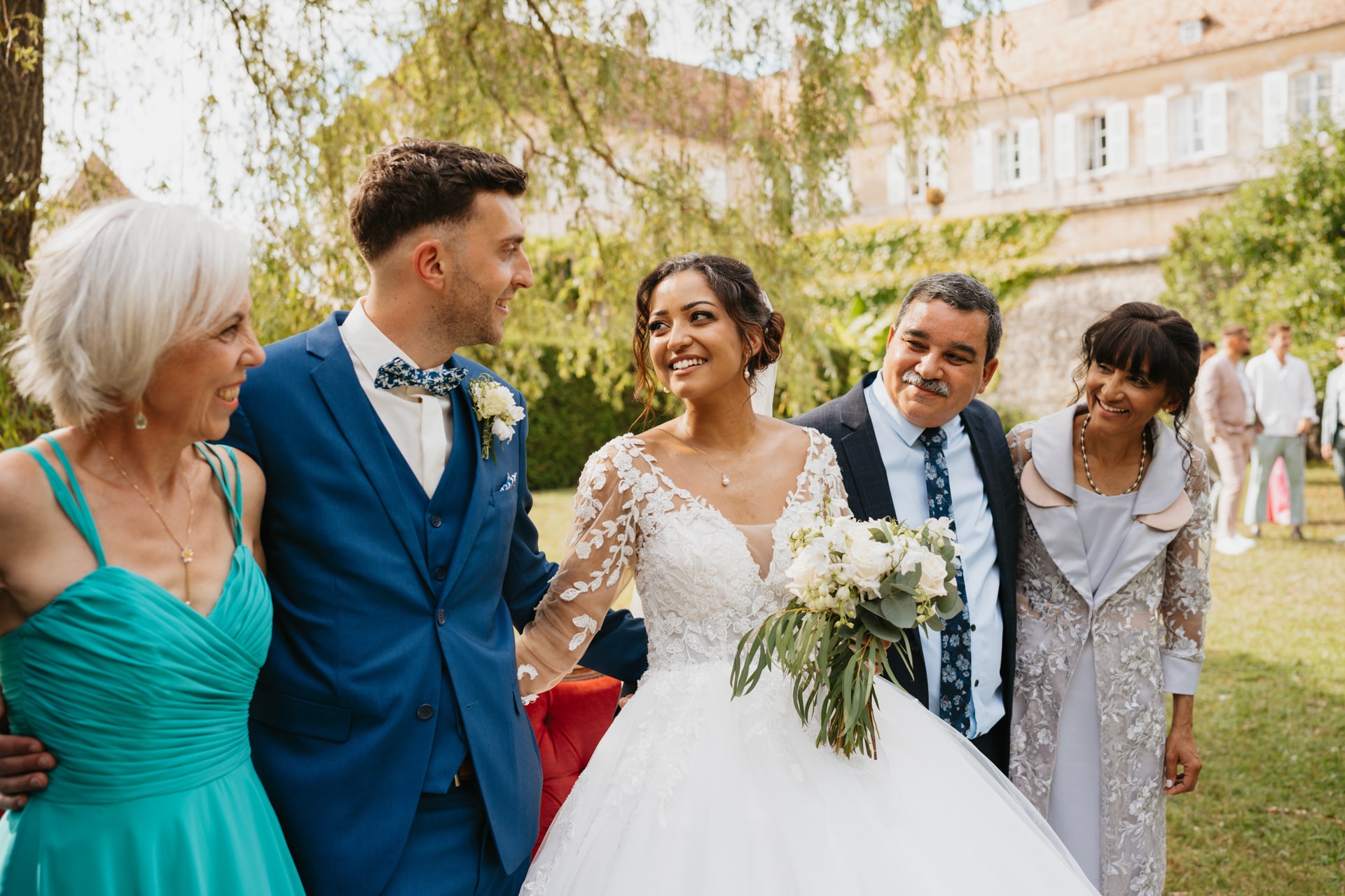 Après la cérémonie, les invités se rassemblent près des élégantes fontaines du château pour un cocktail au soleil et quelques photos de groupe dans lesquels chacun se prend plus ou moins au sérieux pour immortaliser les retrouvailles. Les rires flottent dans l’air, et le champagne coule à flot dans une ambiance conviviale. Lorsque la pluie s’invite, Meagan et Jean-Baptiste en profitent pour faire quelques photos de couple dans le château en toute intimité.