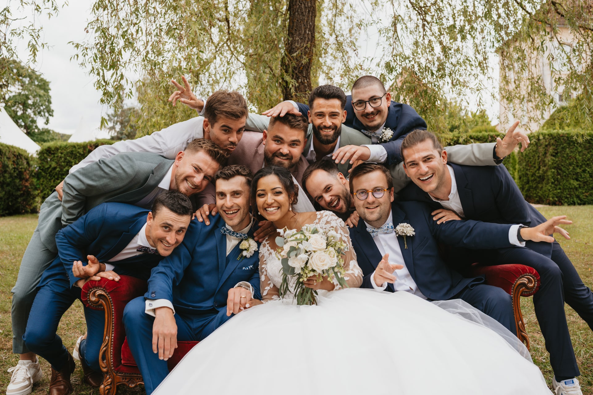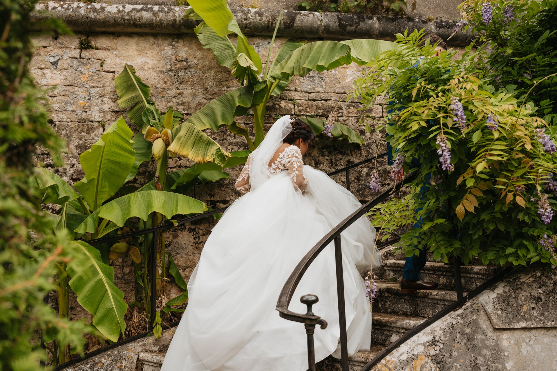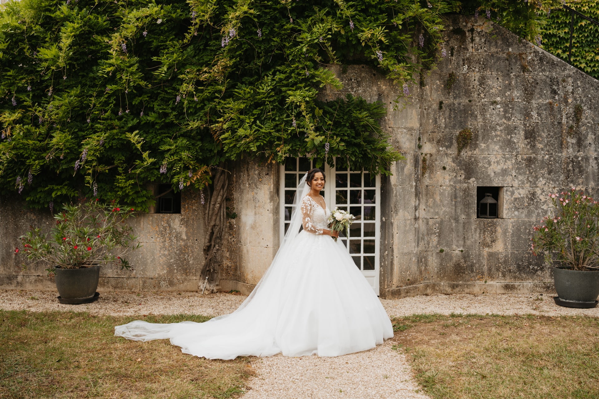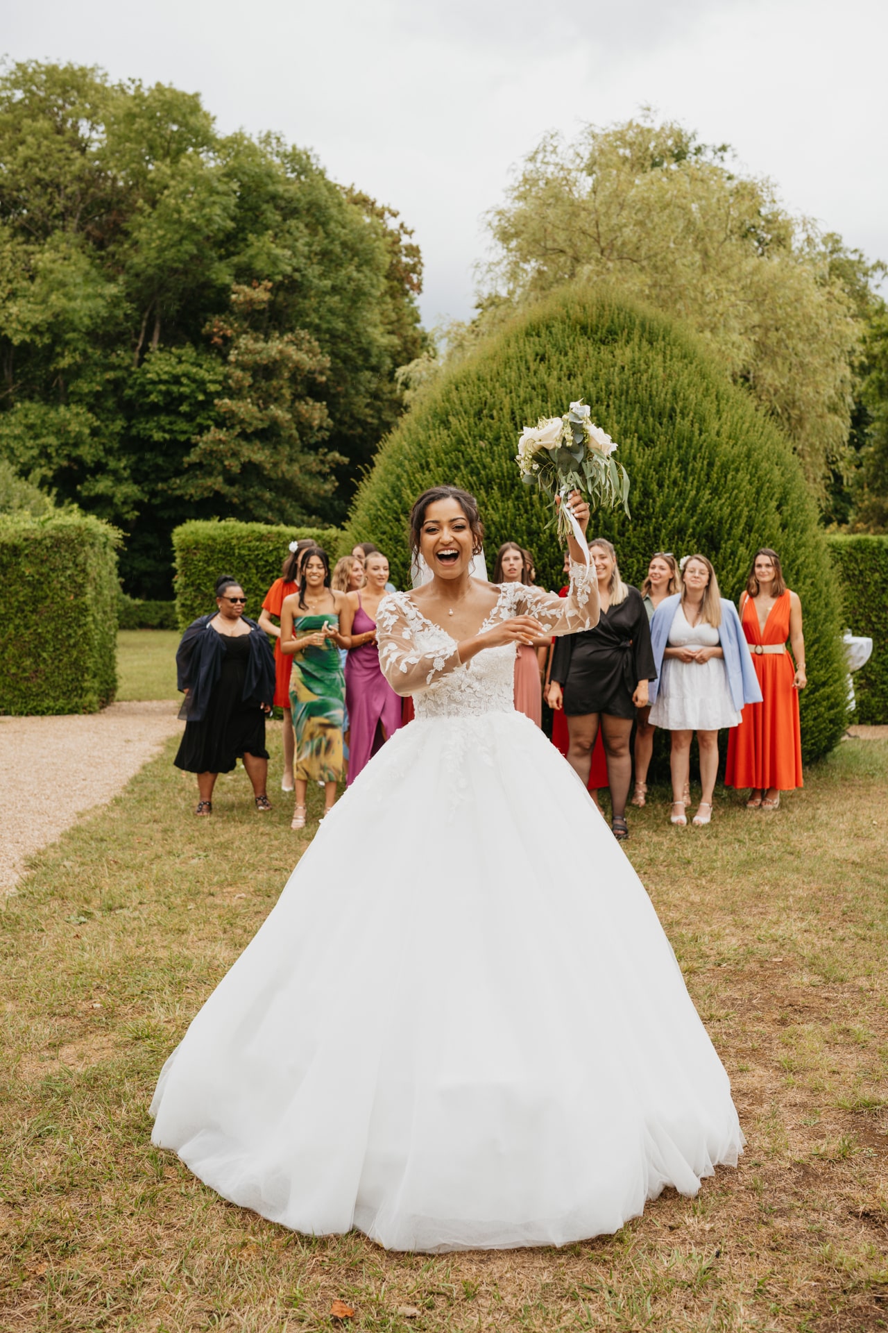 Après la cérémonie, les invités se rassemblent près des élégantes fontaines du château pour un cocktail au soleil et quelques photos de groupe dans lesquels chacun se prend plus ou moins au sérieux pour immortaliser les retrouvailles. Les rires flottent dans l’air, et le champagne coule à flot dans une ambiance conviviale. Lorsque la pluie s’invite, Meagan et Jean-Baptiste en profitent pour faire quelques photos de couple dans le château en toute intimité.