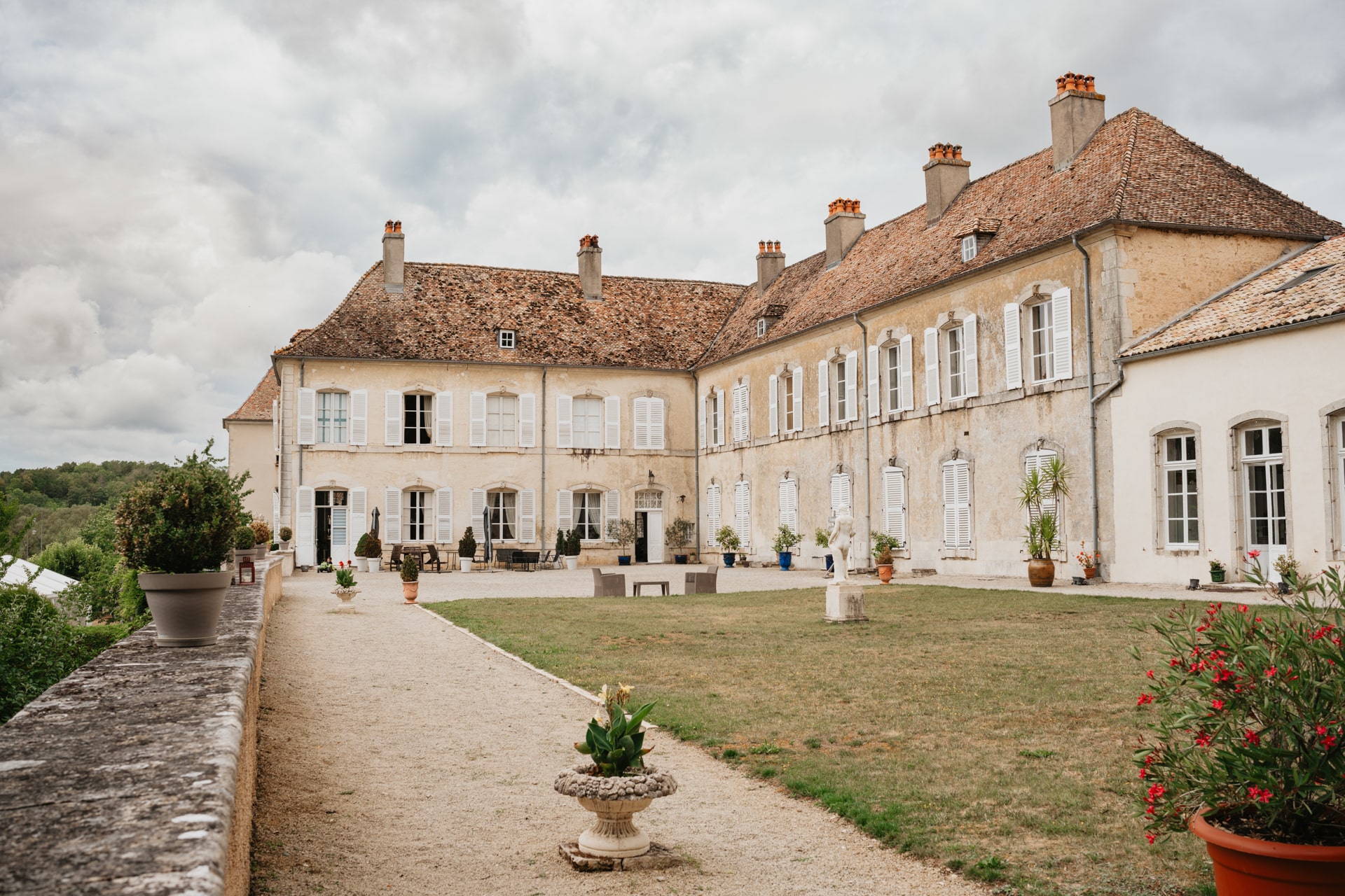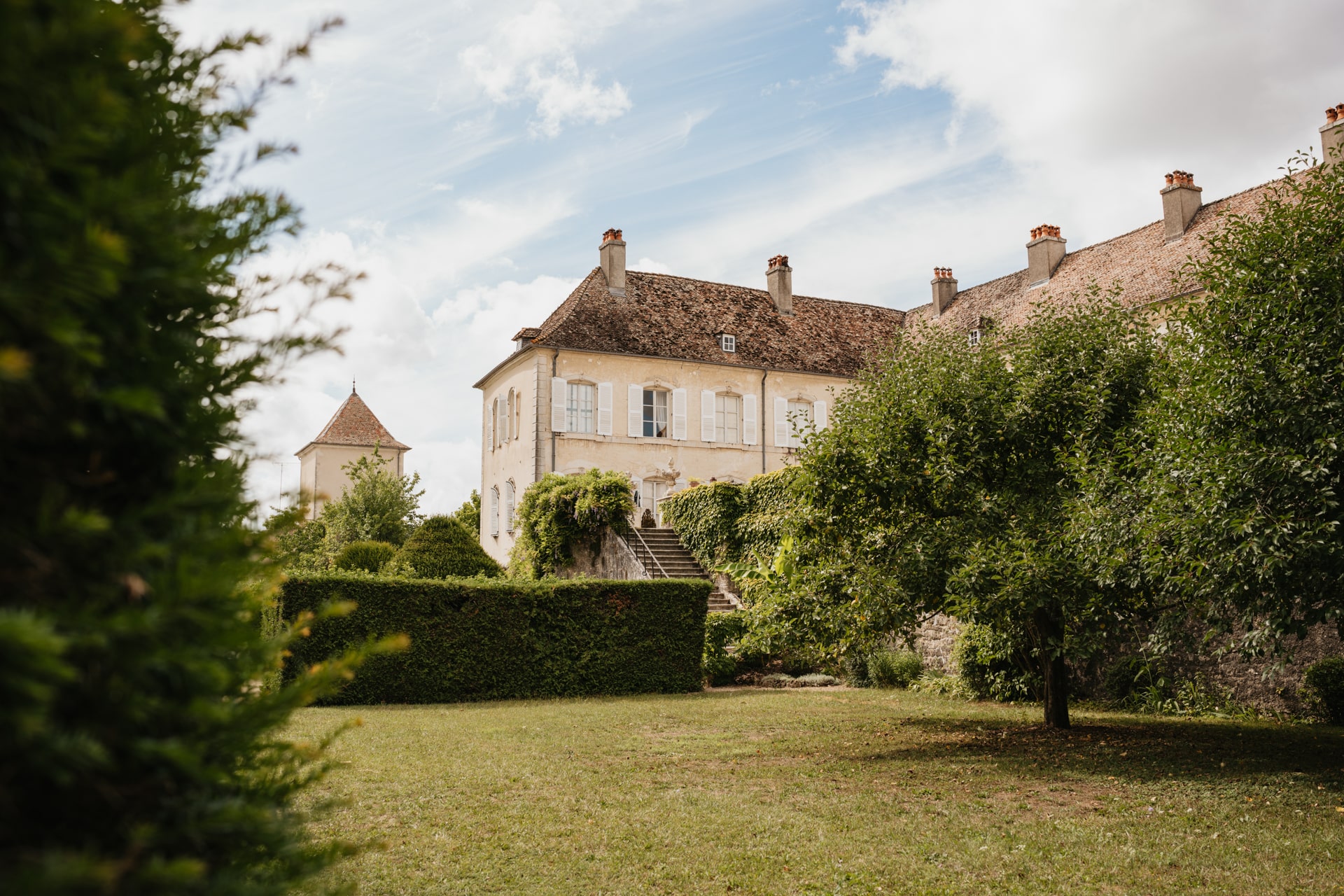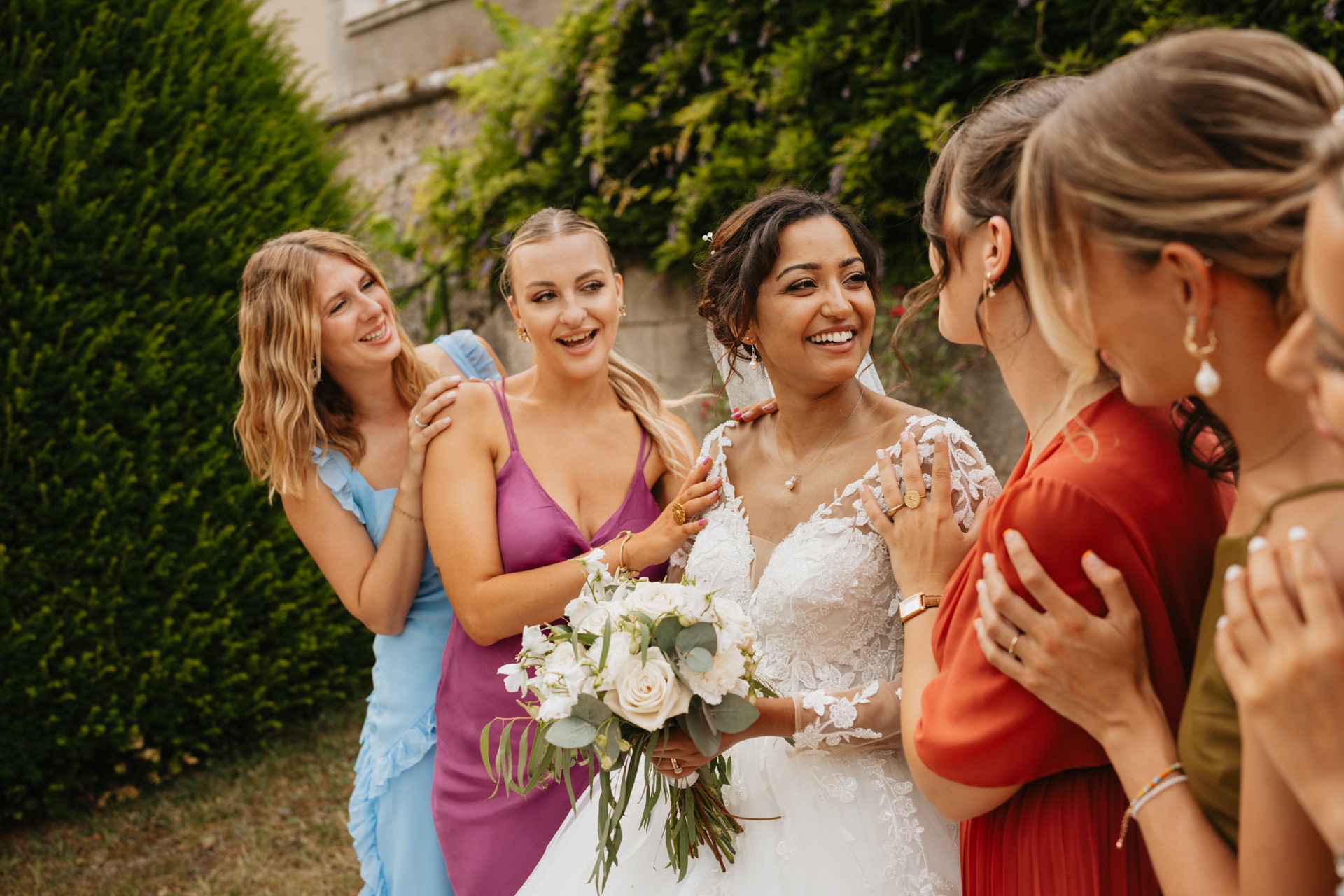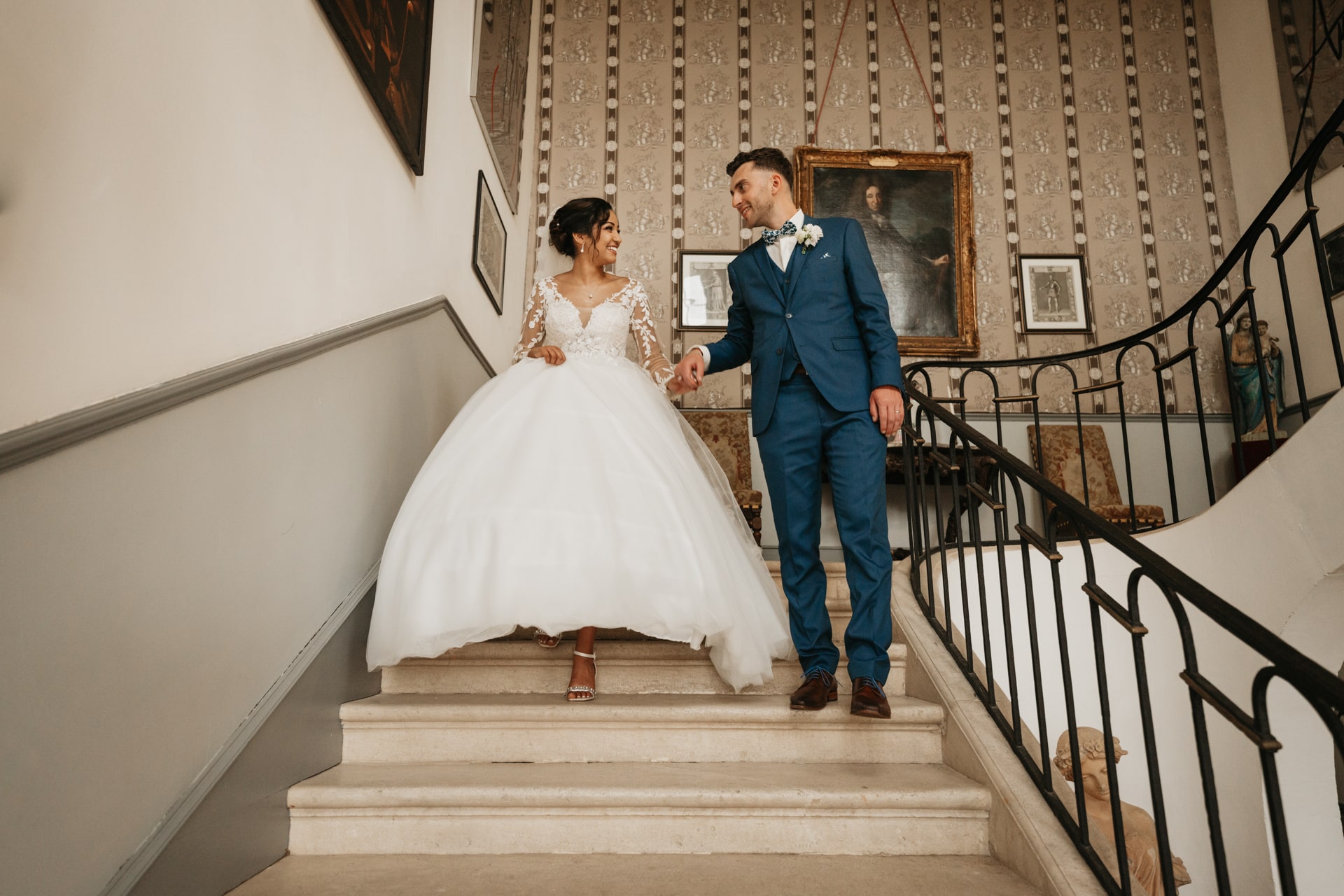 Après la cérémonie, les invités se rassemblent près des élégantes fontaines du château pour un cocktail au soleil et quelques photos de groupe dans lesquels chacun se prend plus ou moins au sérieux pour immortaliser les retrouvailles. Les rires flottent dans l’air, et le champagne coule à flot dans une ambiance conviviale. Lorsque la pluie s’invite, Meagan et Jean-Baptiste en profitent pour faire quelques photos de couple dans le château en toute intimité.