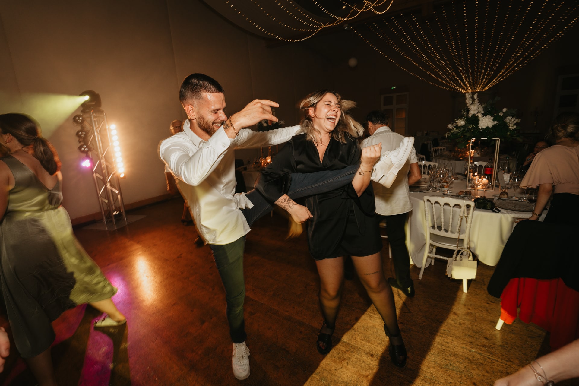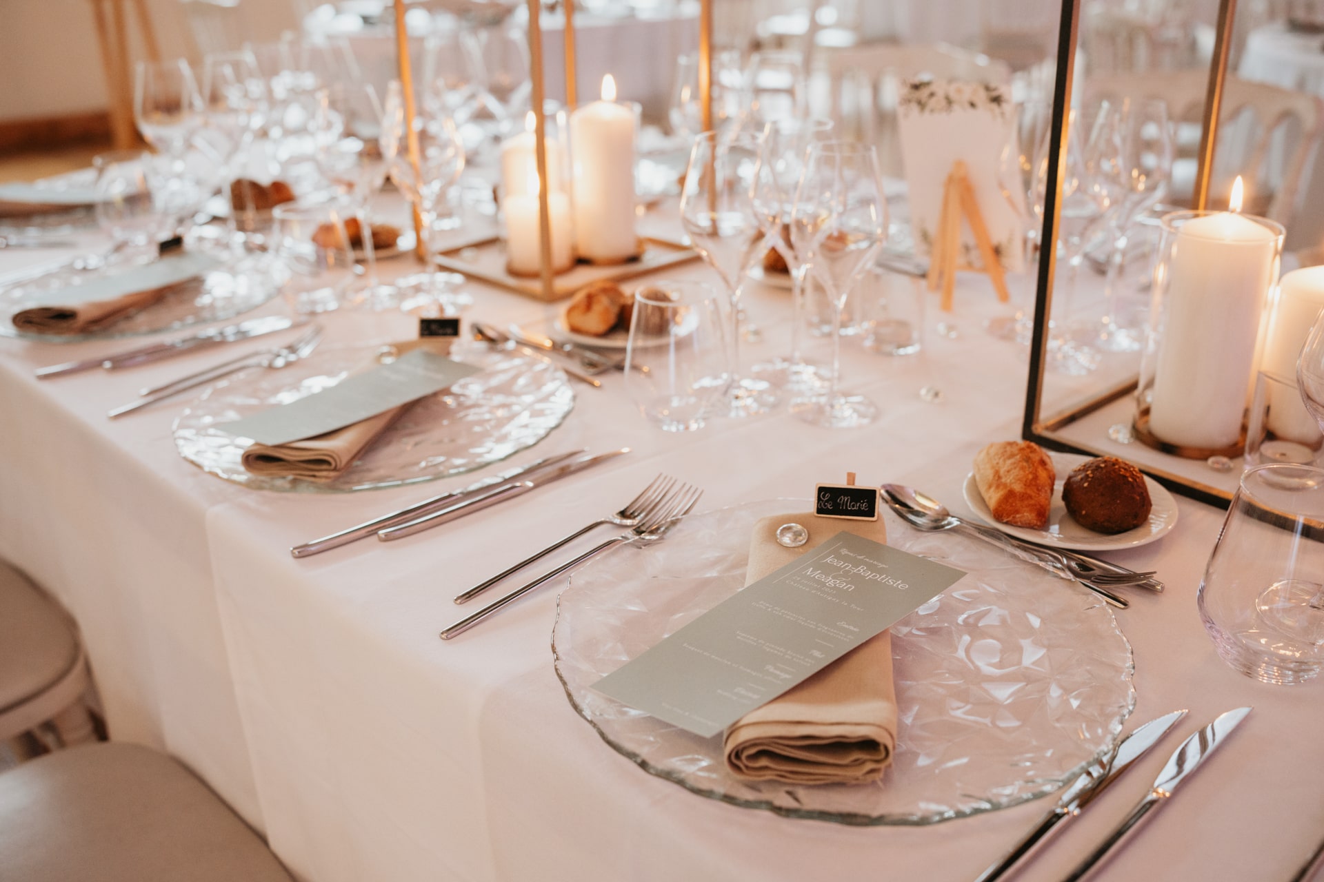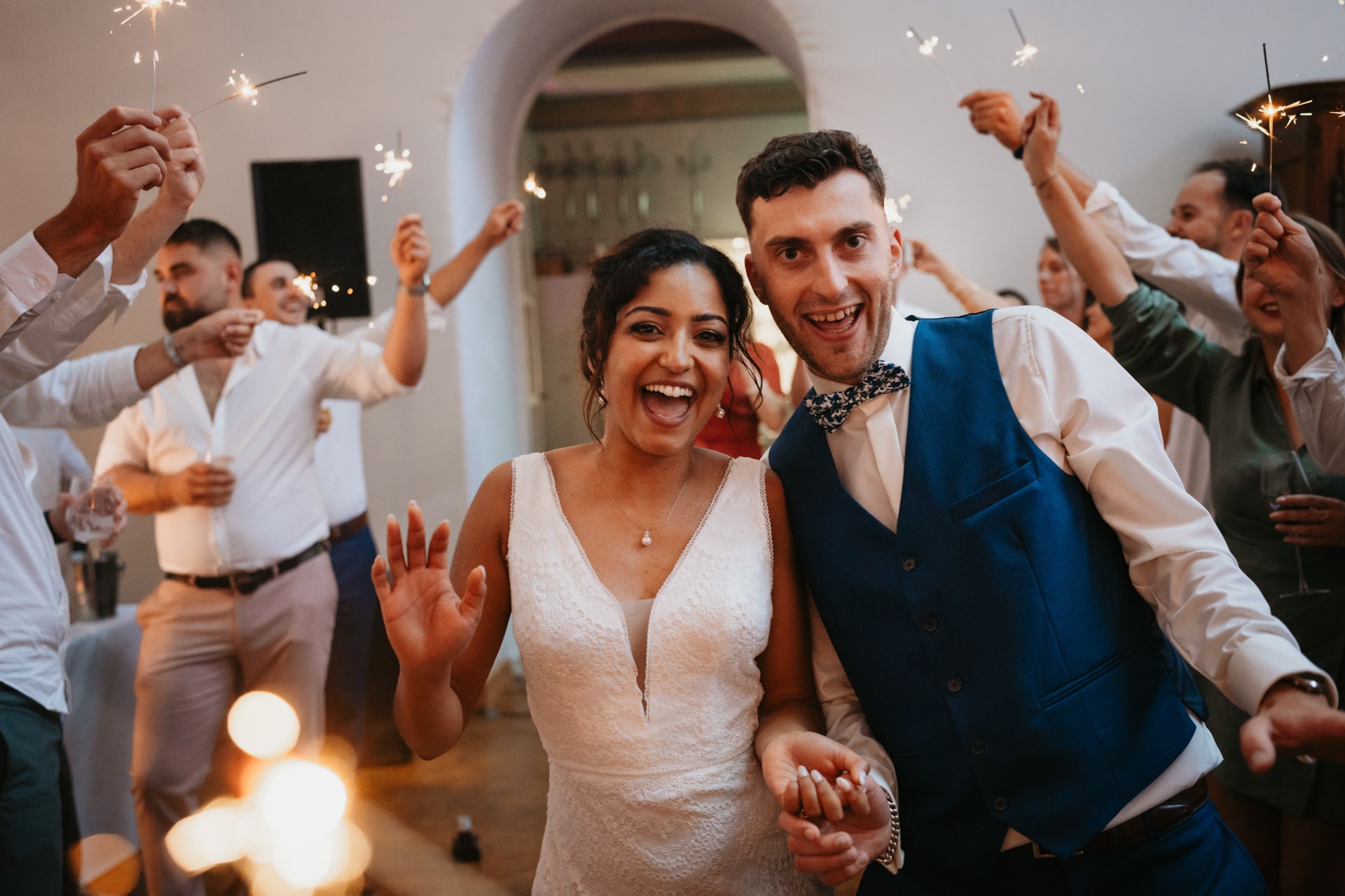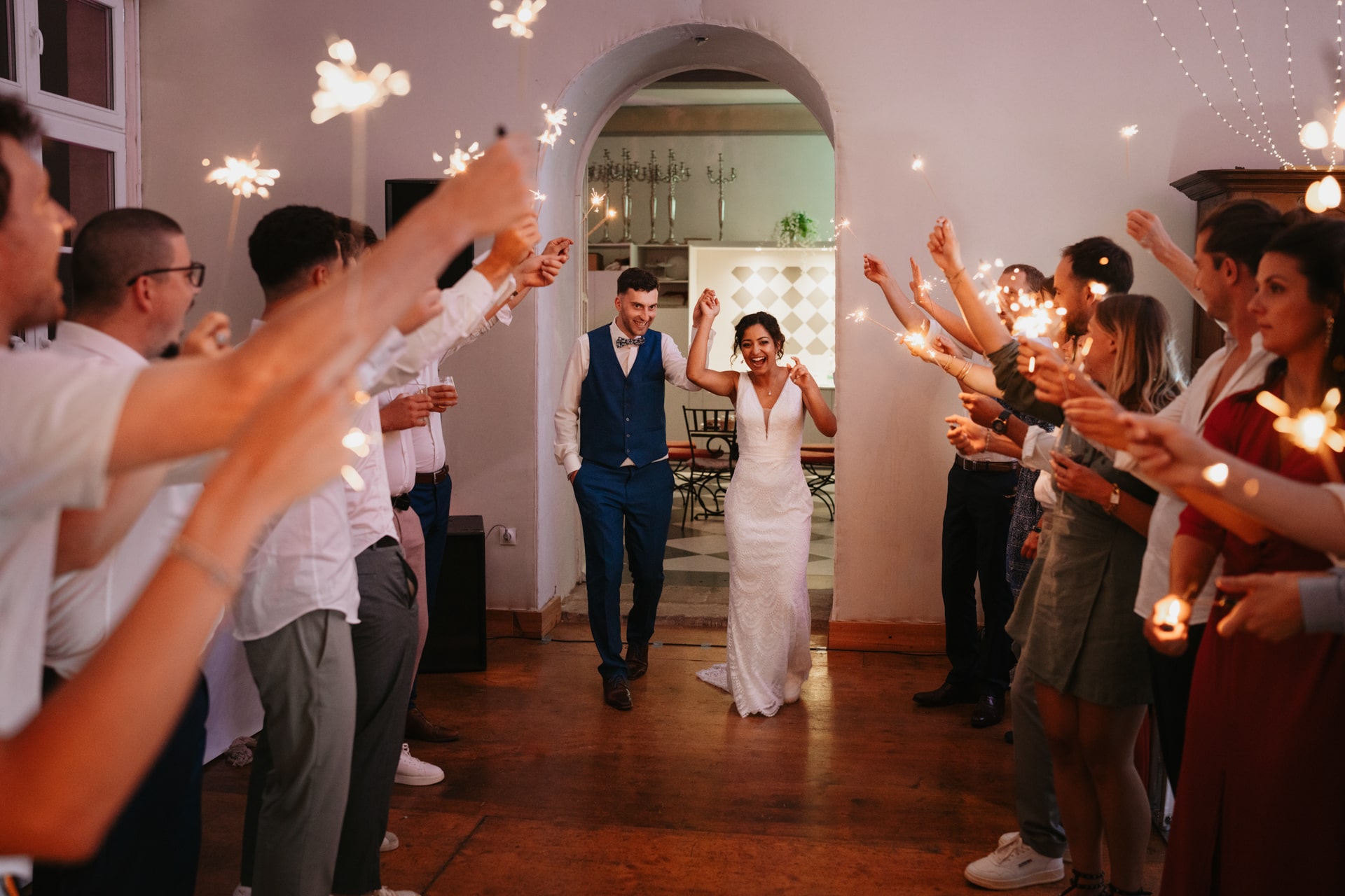 A la tombée de la nuit, la fête continue à l’intérieur. Les invités accueillent Meagan et Jean-Baptiste sous une haie d’honneur bordée d’étincelles. Ils ont pris place dans la salle chaleureuse et lumineuse, à la décoration épurée. Tout est préparé avec soin dans les moindres détails. Une farandole de plats délicieux s’enchaînent, le tout dans une ambiance détendue. Puis vient l’heure de la première danse. La salle s’est remplie d’émotion devant le spectacle offert par les mariés. Famille et amis ont dansé jusqu’au bout de la nuit, partageant histoires, rires et ce genre d’énergie unique qui naît quand l’amour est réel et sincère.