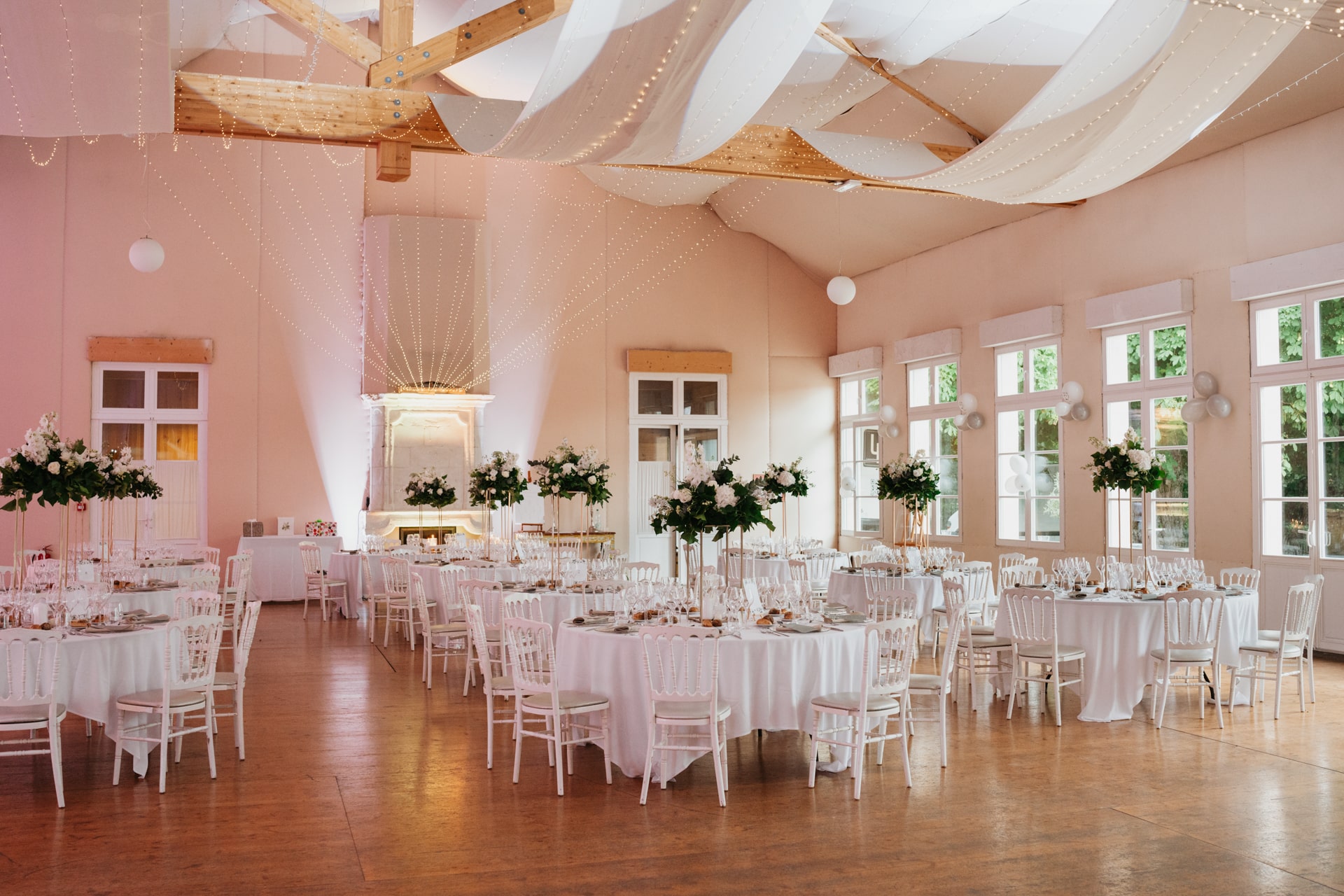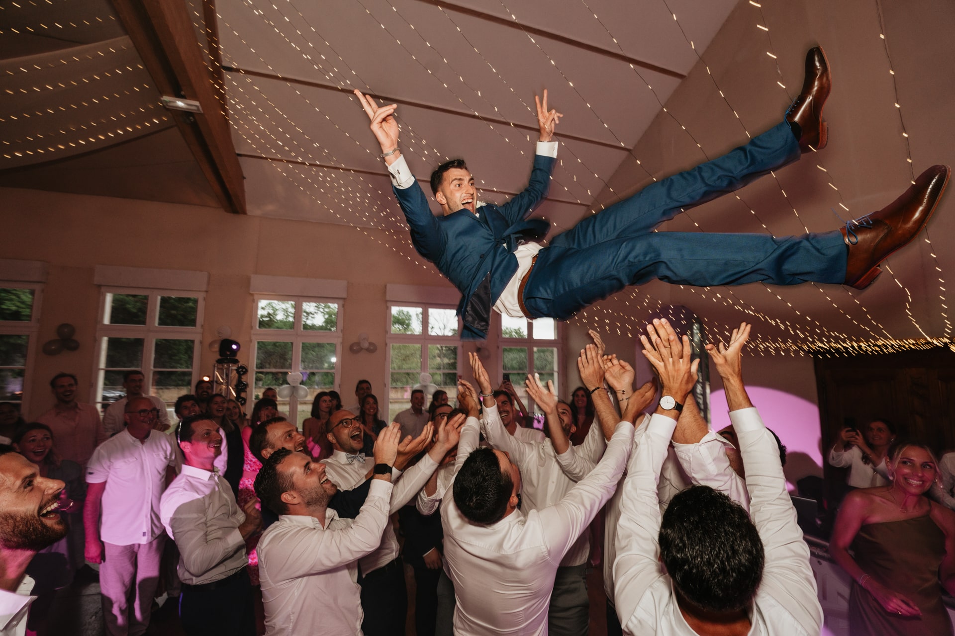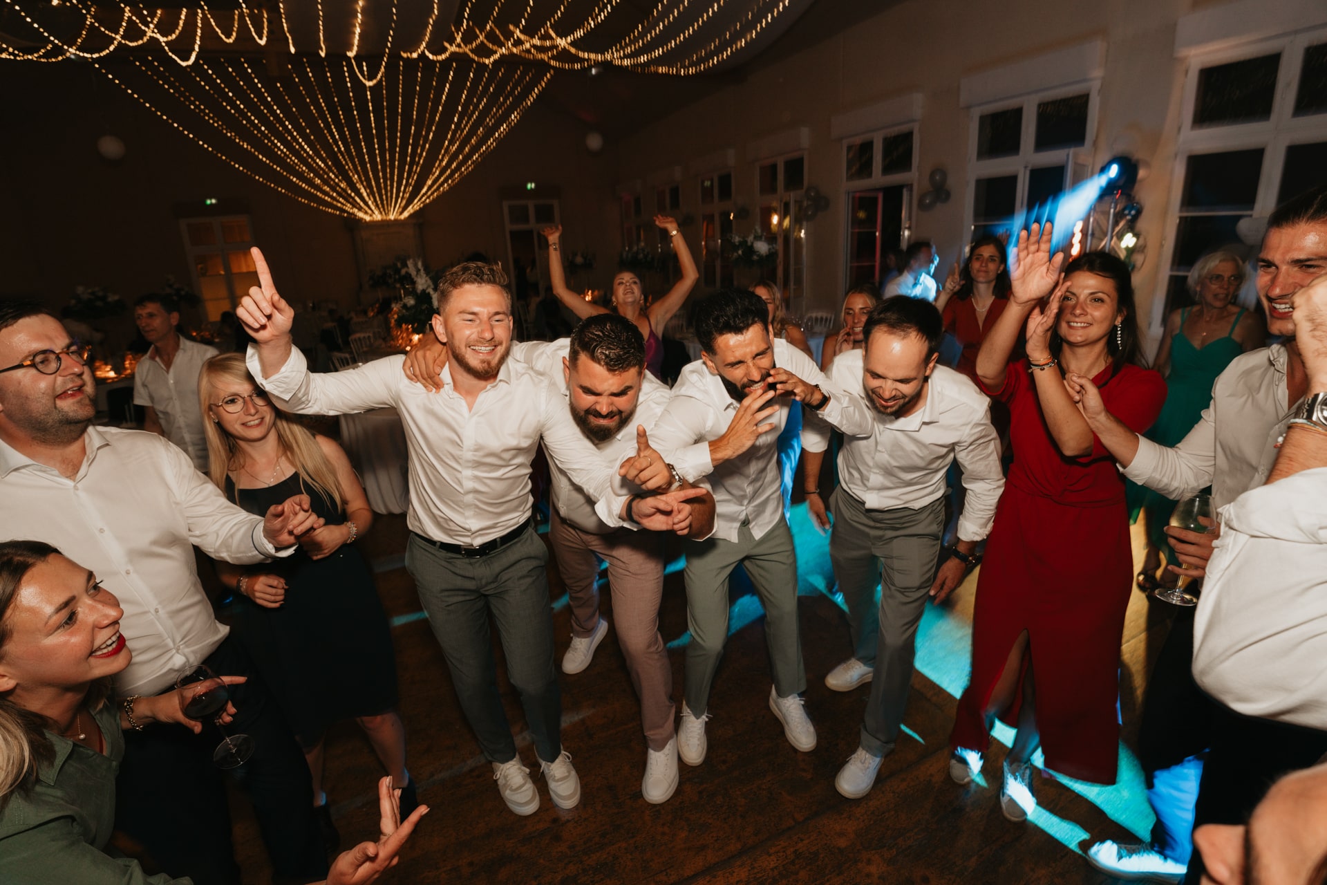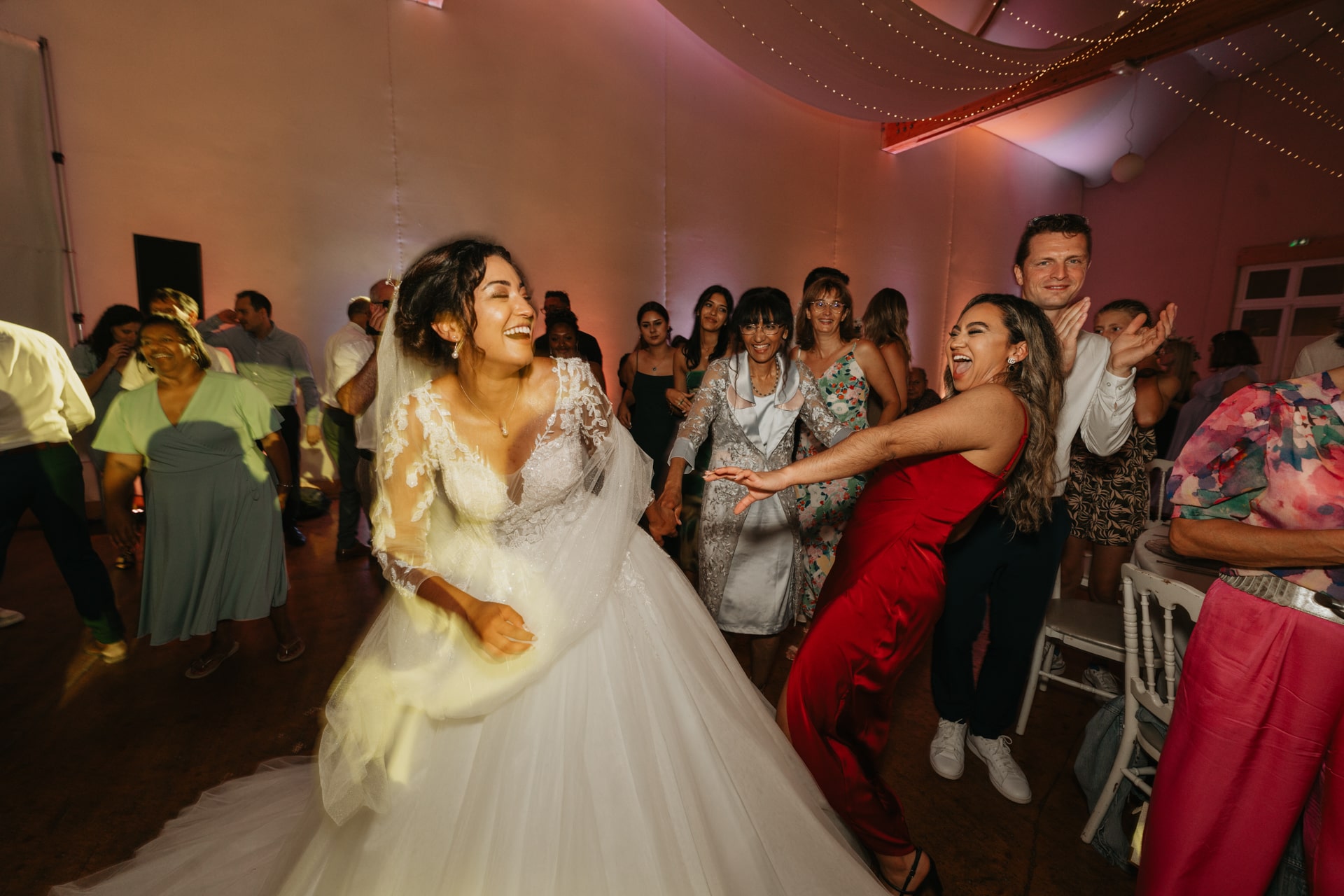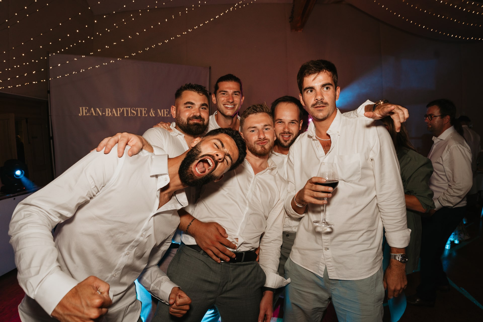 A la tombée de la nuit, la fête continue à l’intérieur. Les invités accueillent Meagan et Jean-Baptiste sous une haie d’honneur bordée d’étincelles. Ils ont pris place dans la salle chaleureuse et lumineuse, à la décoration épurée. Tout est préparé avec soin dans les moindres détails. Une farandole de plats délicieux s’enchaînent, le tout dans une ambiance détendue. Puis vient l’heure de la première danse. La salle s’est remplie d’émotion devant le spectacle offert par les mariés. Famille et amis ont dansé jusqu’au bout de la nuit, partageant histoires, rires et ce genre d’énergie unique qui naît quand l’amour est réel et sincère.