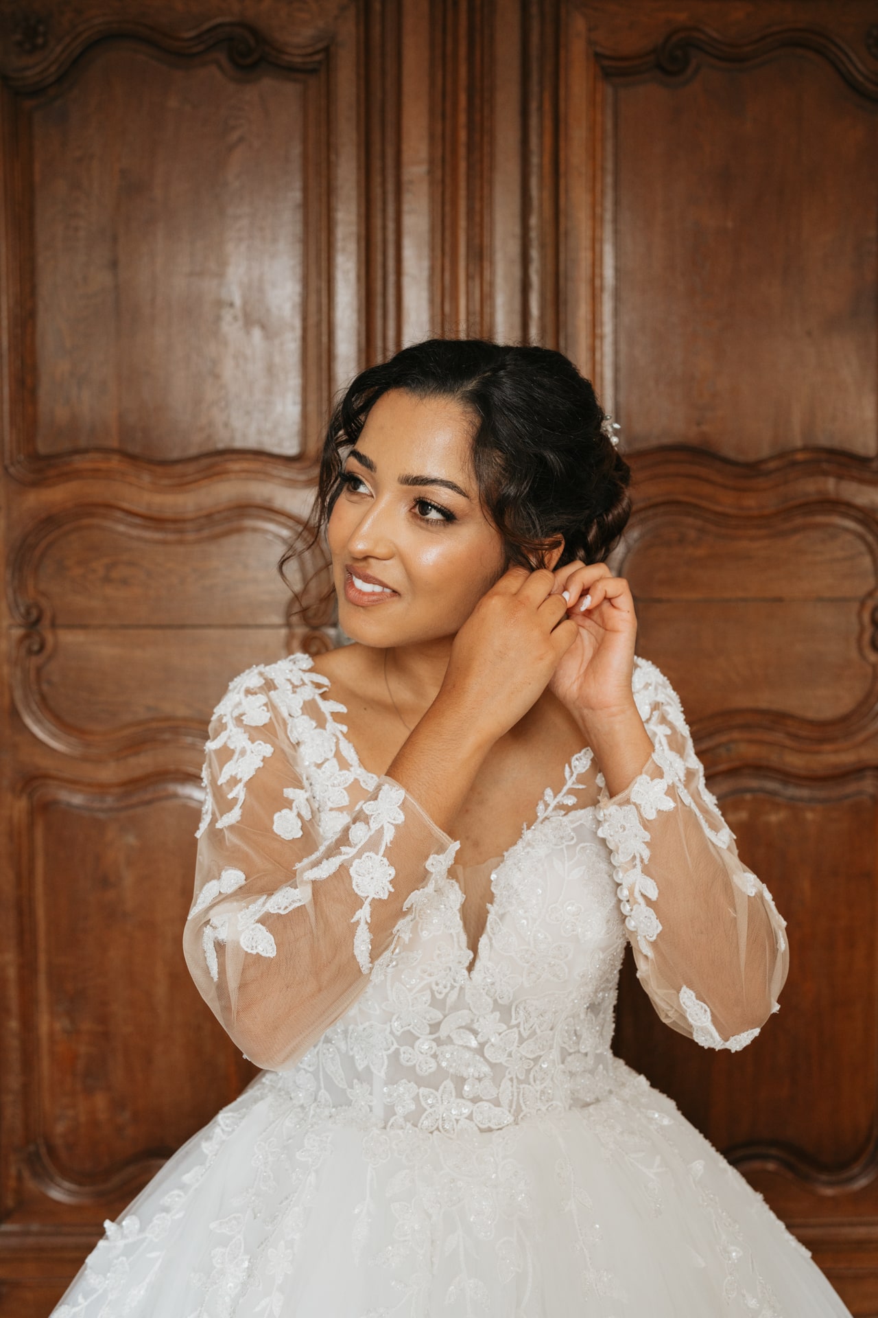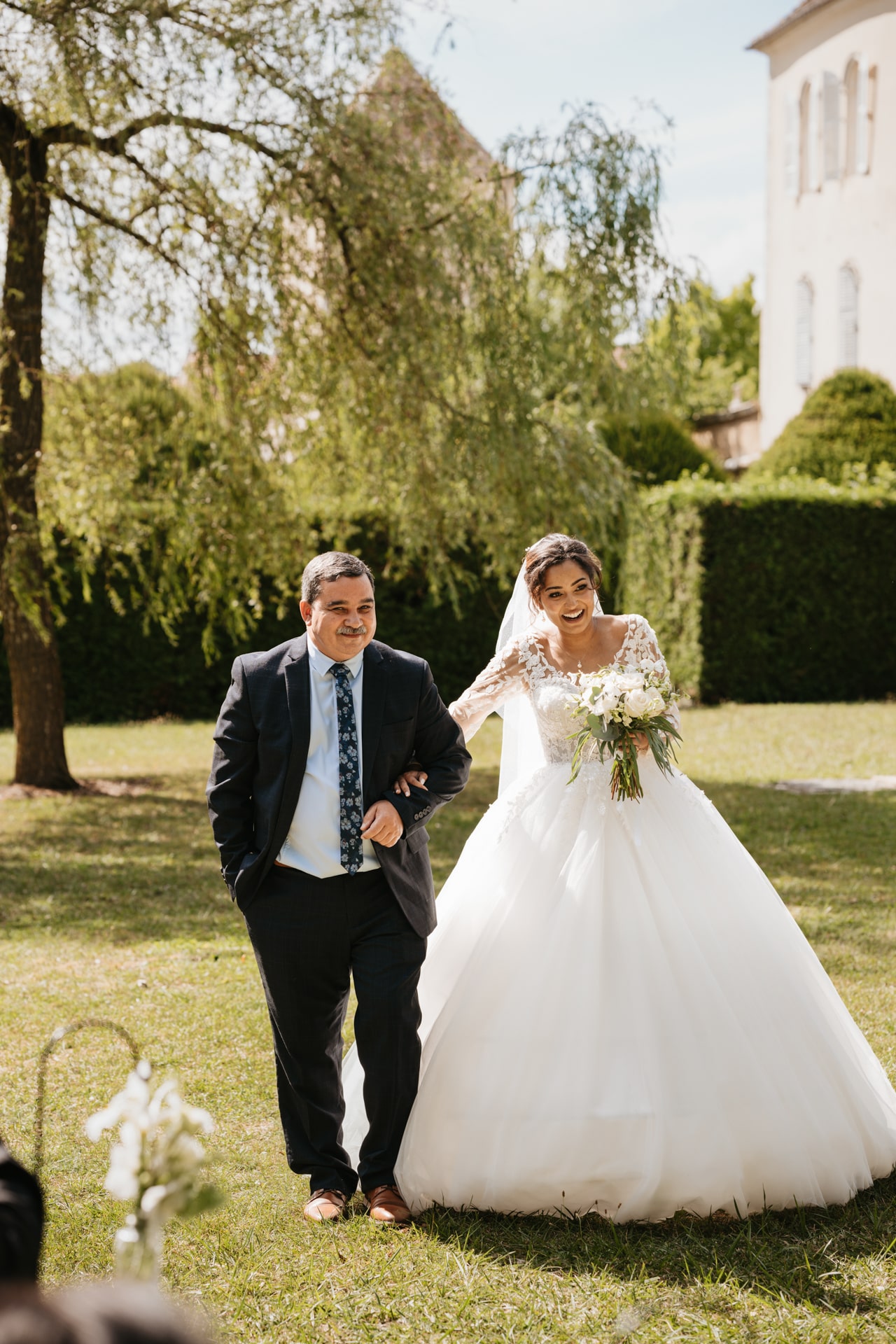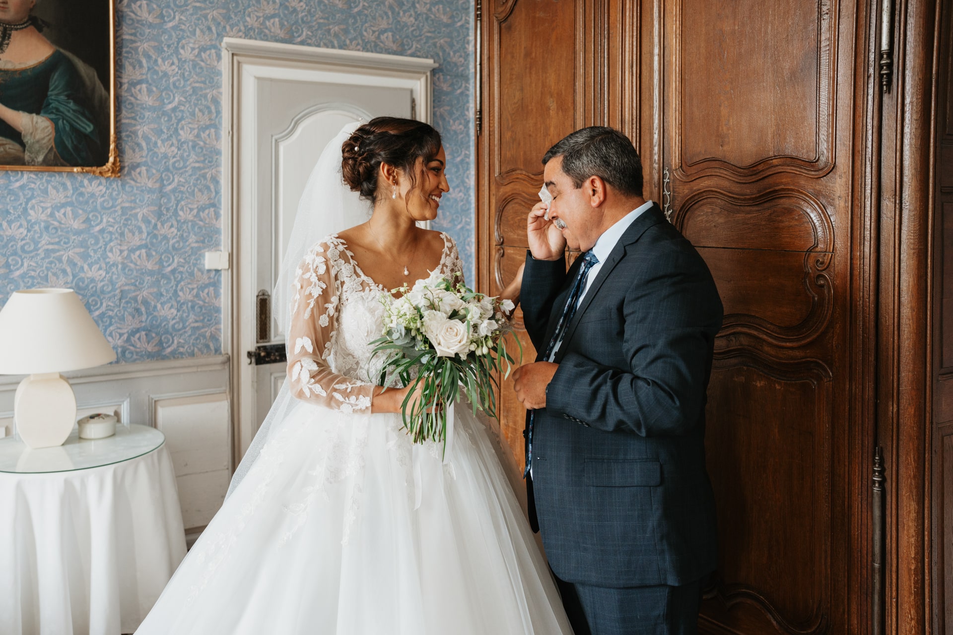 La journée commence doucement, avec la magie des préparatifs dans les chambres du château, le soleil traverse les vieilles fenêtres. Meagan et Jean-Baptiste sont entourés de leur proche, et l’excitation monte progressivement pendant qu’ils se préparent chacun de leur côté. C’est le moment de prendre en photo tous les petits détails qui reflètent l’essence du mariage : papeterie, bouquet, alliances, photos du lieu, portraits à la volée… La première découverte entre Megan et son papa avant qu’elle ne se marie est bouleversante.