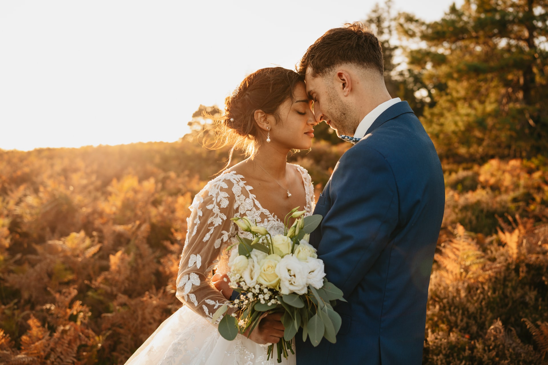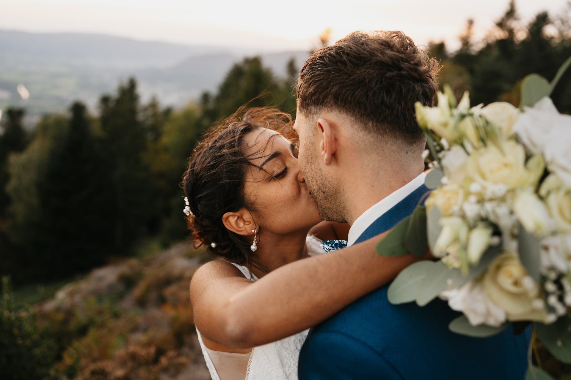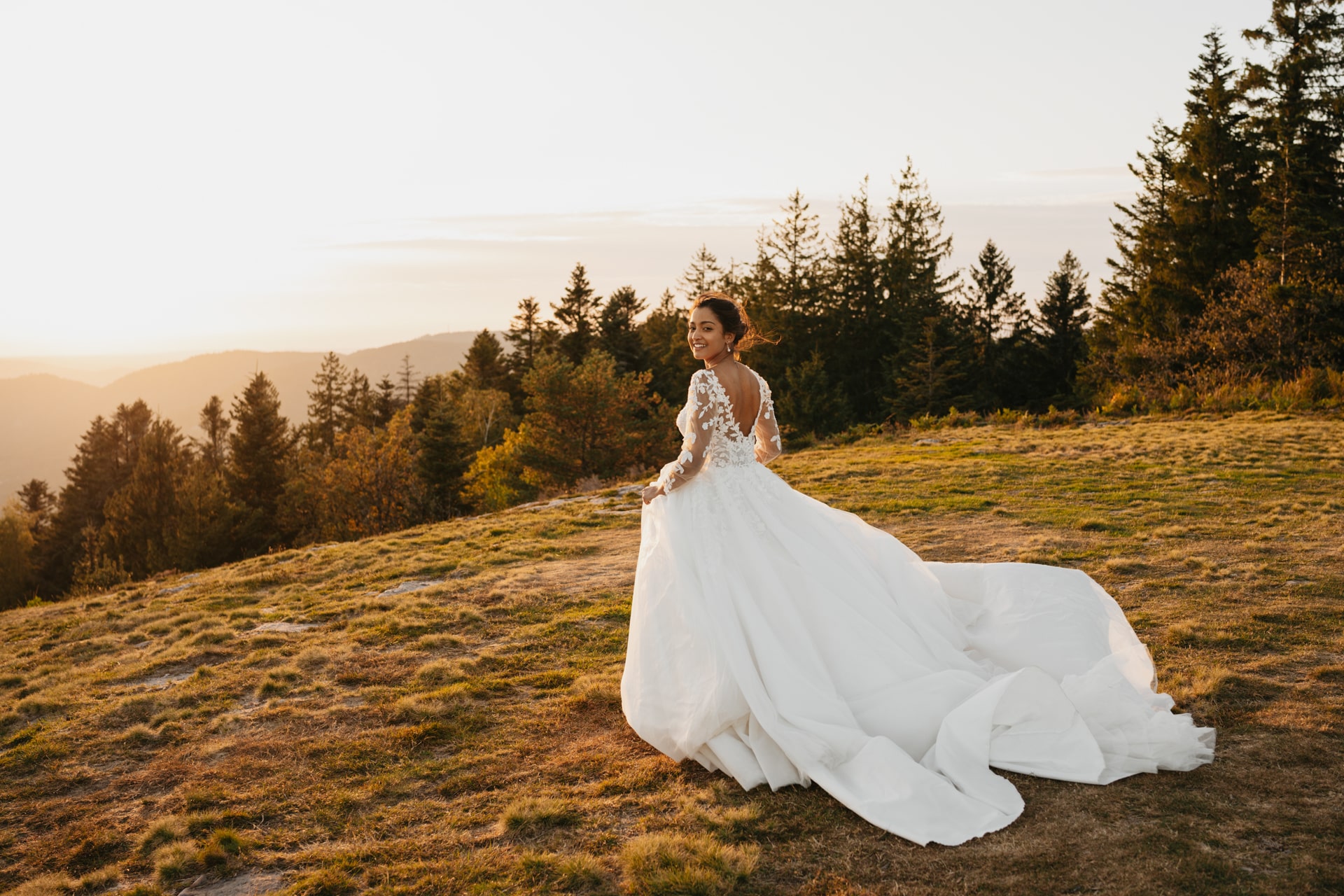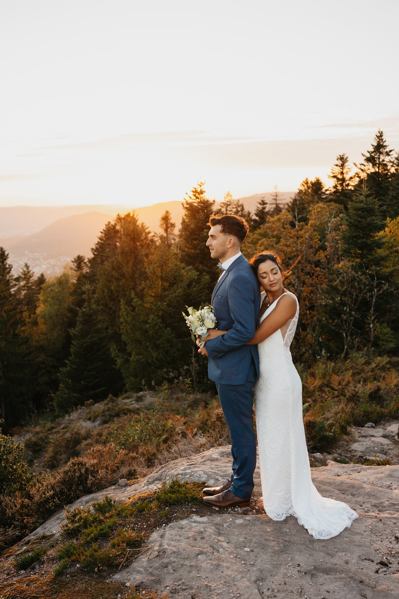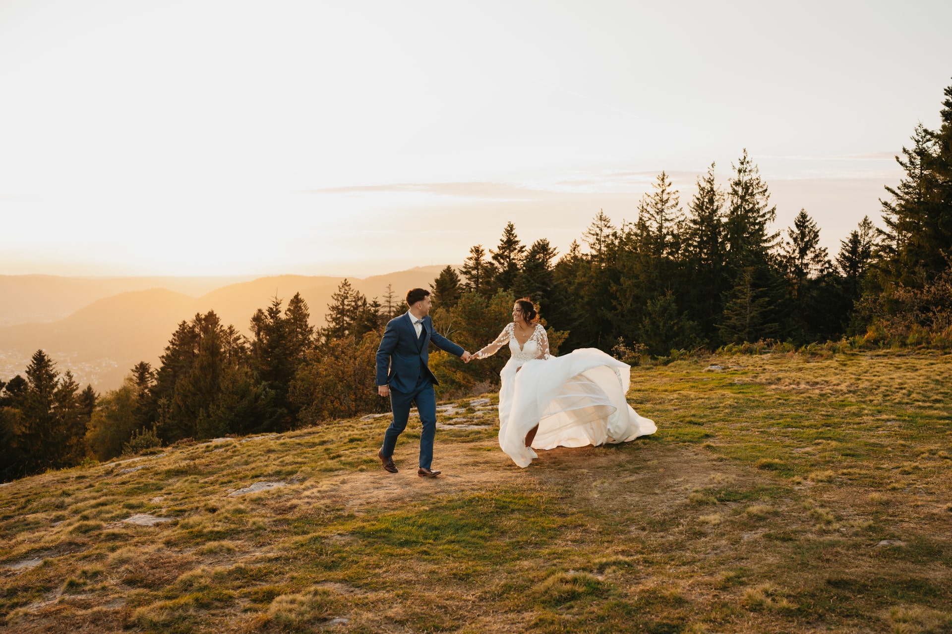 Quelques mois après cette journée incroyable, Meagan et Jean-Baptiste me contactent pour réaliser leur séance Day After. L’occasion de porter une nouvelle fois les tenues du grand jour, mais aussi de choisir la date idéale pour profiter de la magnifique golden hour dans les montagnes vosgiennes. C’est à l’automne que nos chemins se croisent de nouveaux et je les guides avec douceur d’un paysage doré à un autre, avec leur fidèle compagnon à leurs côtés. Une belle occasion d’ajouter encore une page à ce merveilleux chapitre de leur vie.
