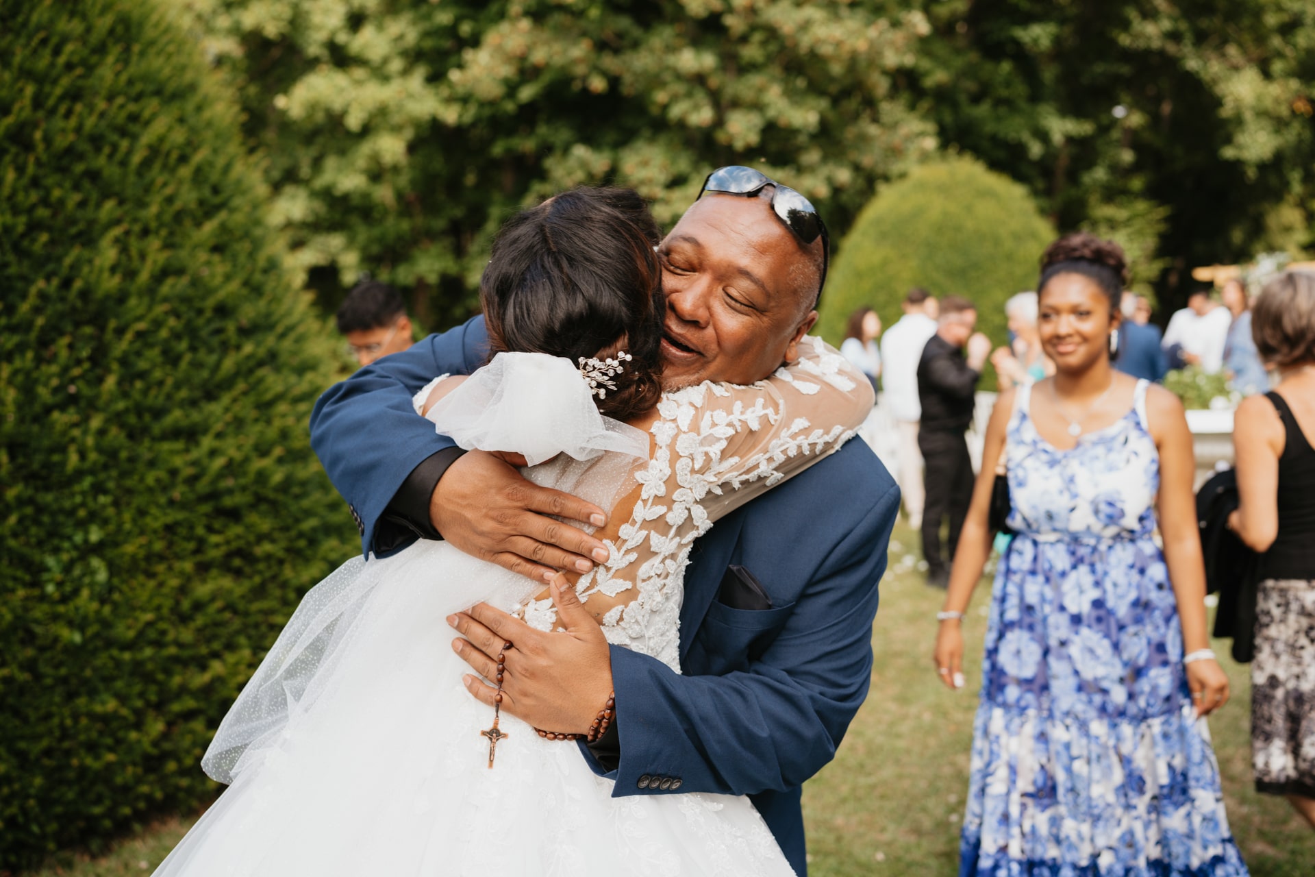La cérémonie a lieu dans les jardins du château, sous un ciel doux et entourés de fleurs et de verdure. Quand Meagan fait son entrée, les larmes se mettent à couler discrètement. Les familles et leurs amis ne parlent pas peut-être pas la même langue, mais ils partagent les mêmes sentiments : l’amour et la joie d’être présent.